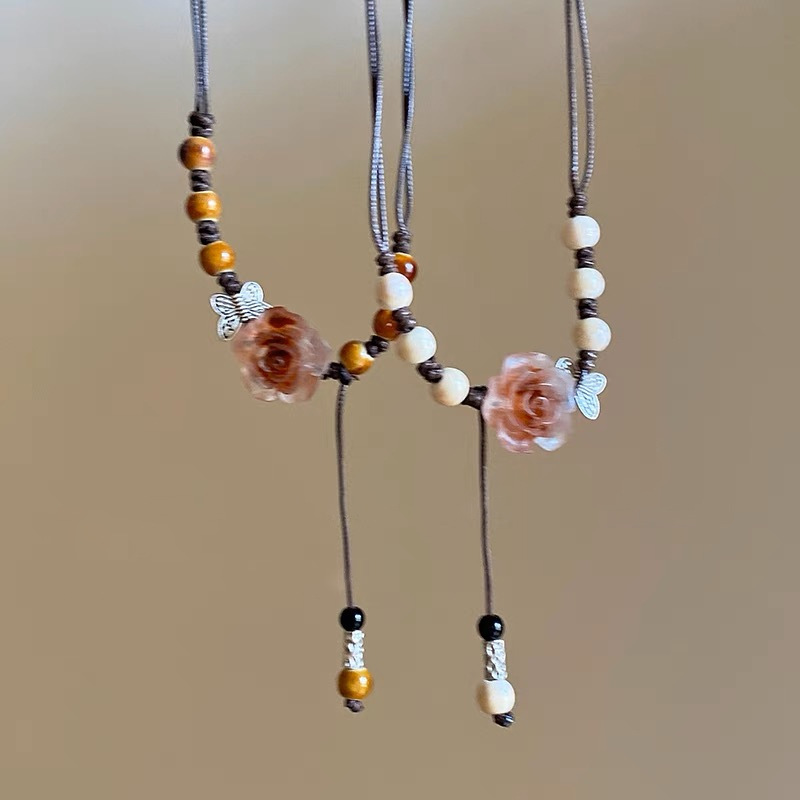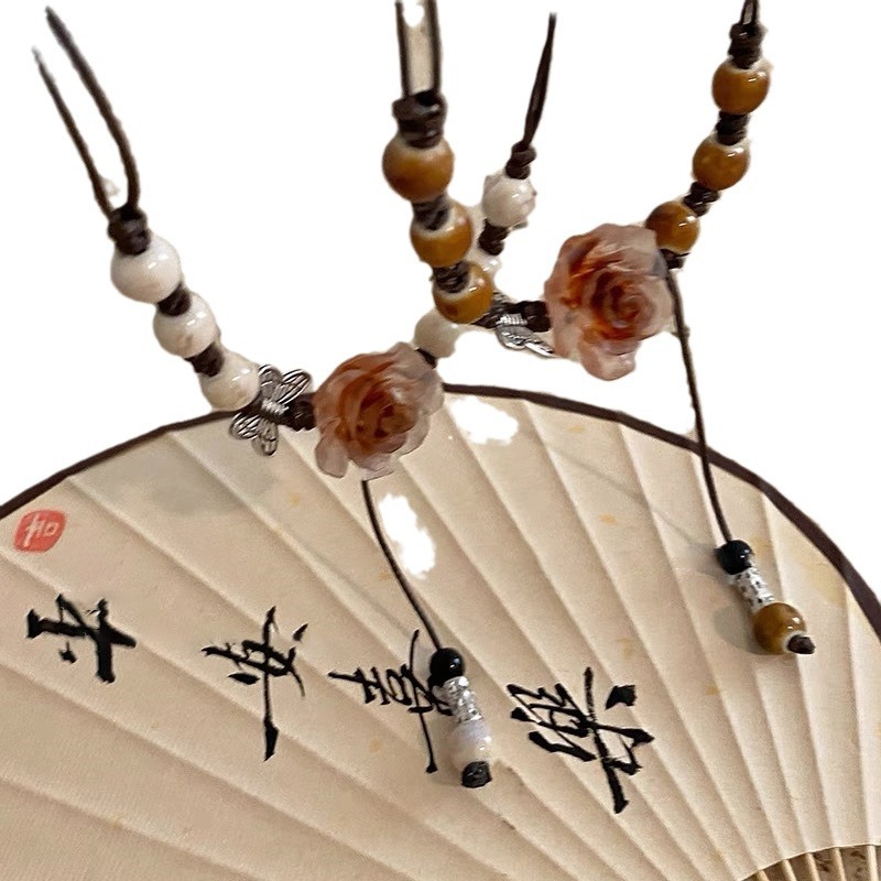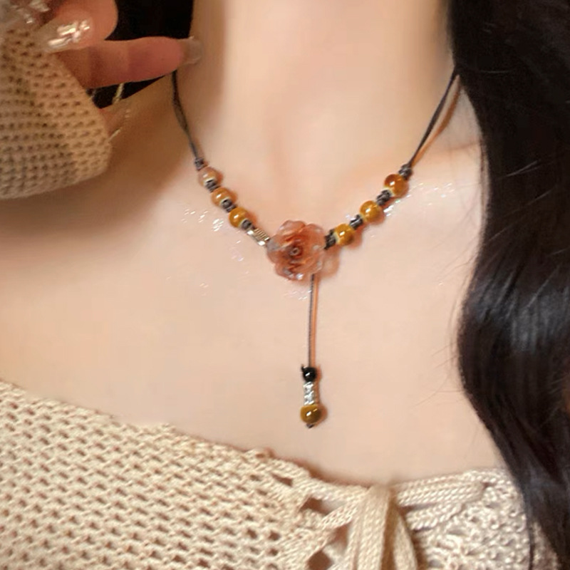 陶瓷玫瑰花编织项链女年新款复古新中式配饰可抽拉长款锁骨链