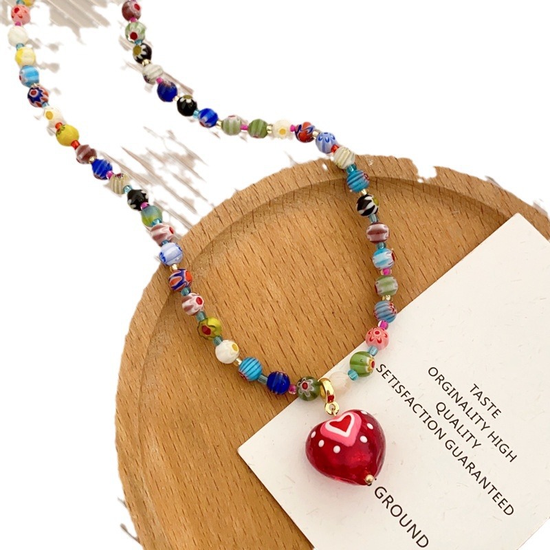 彩色多巴胺琉璃爱心吊坠项链女甜酷辣妹风串珠锁骨链配饰锁骨颈链
