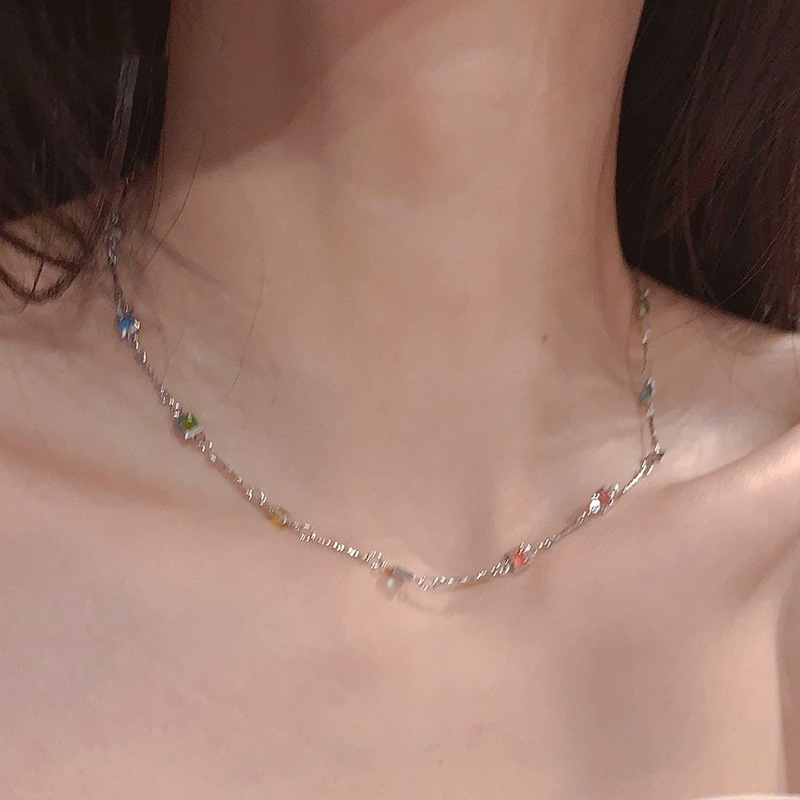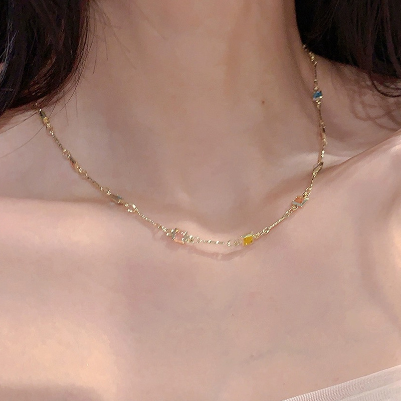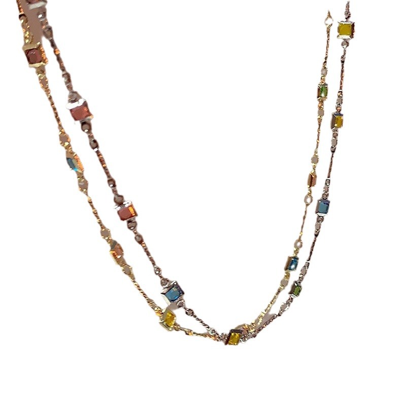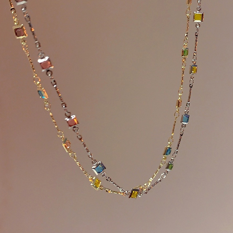 新款方形彩色宝石细锁骨链夏天项链轻奢小众高级感颈链女款项链