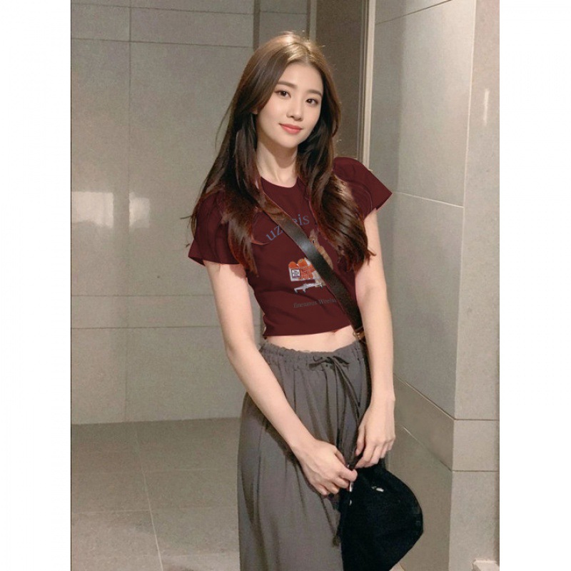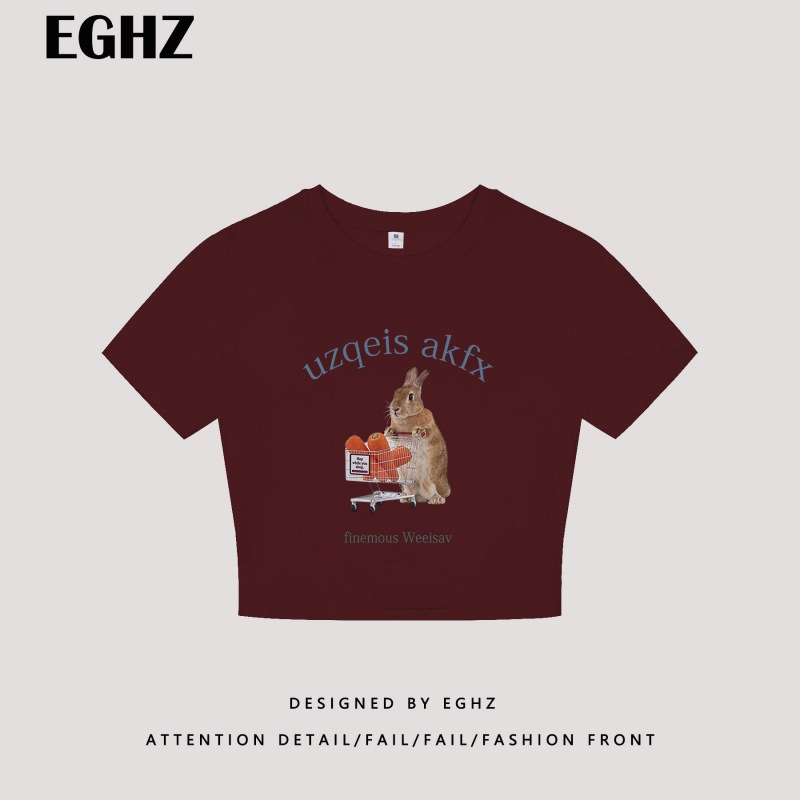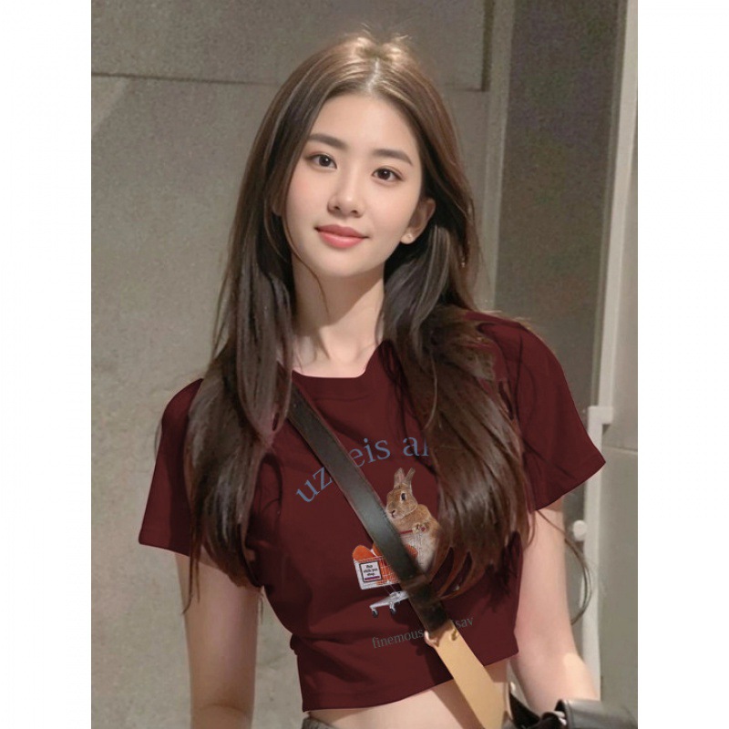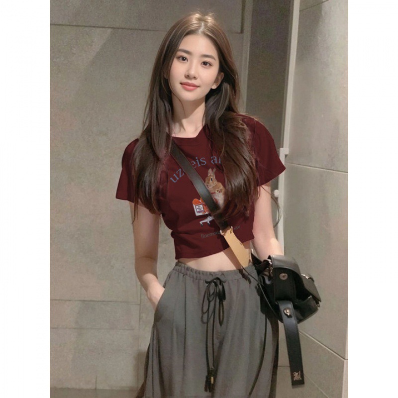 法式甜辣妹酒红色独特别致短上衣夏季女美式复古纯棉短袖t恤体恤