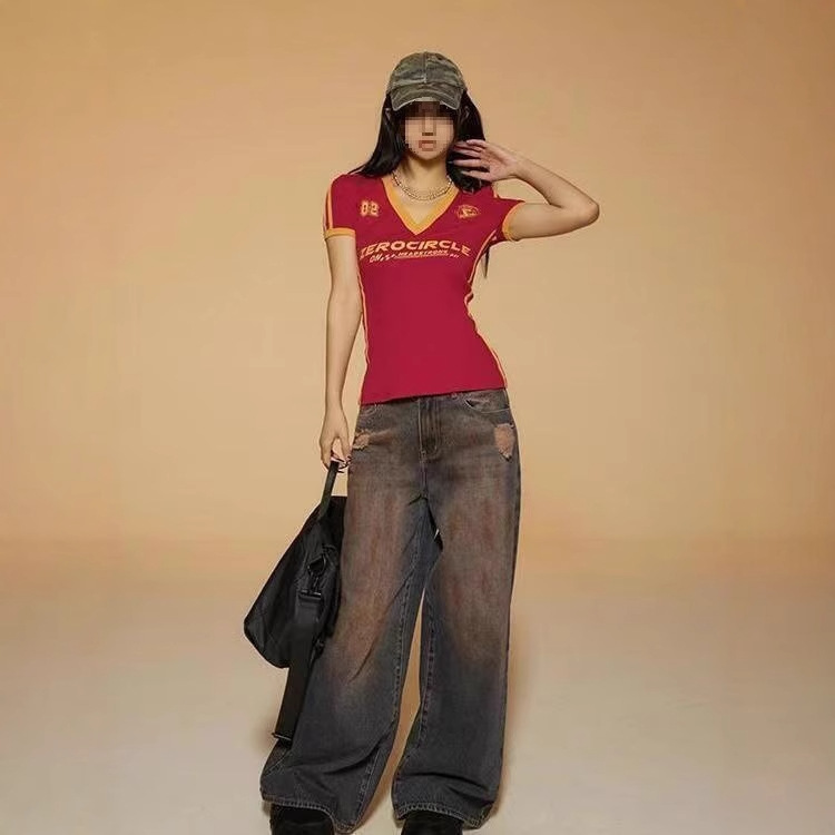 美式y2k复古正肩短袖t恤女夏季纯棉修身显瘦甜酷辣妹撞色拼接上衣