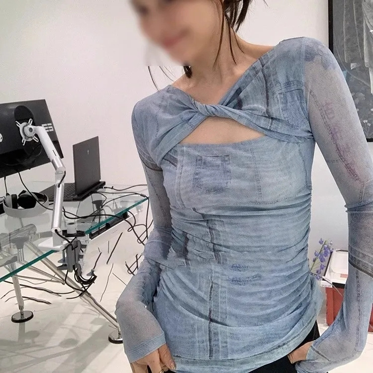 辣妹网纱镂空长袖t恤女夏季防晒薄款别致设计感小众紧身短款上衣