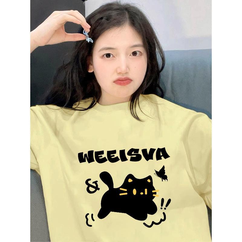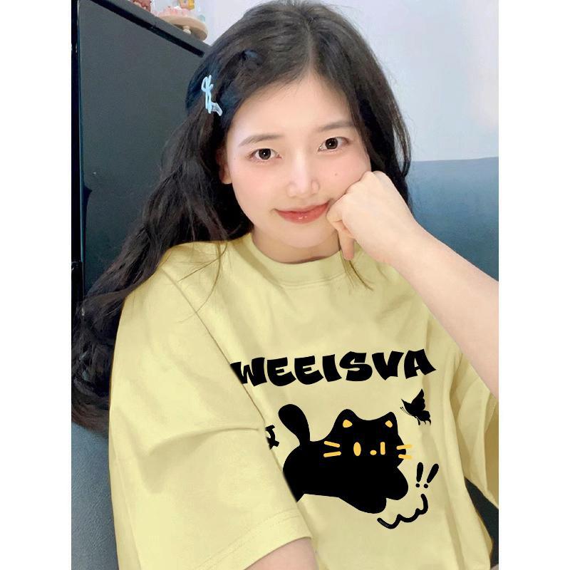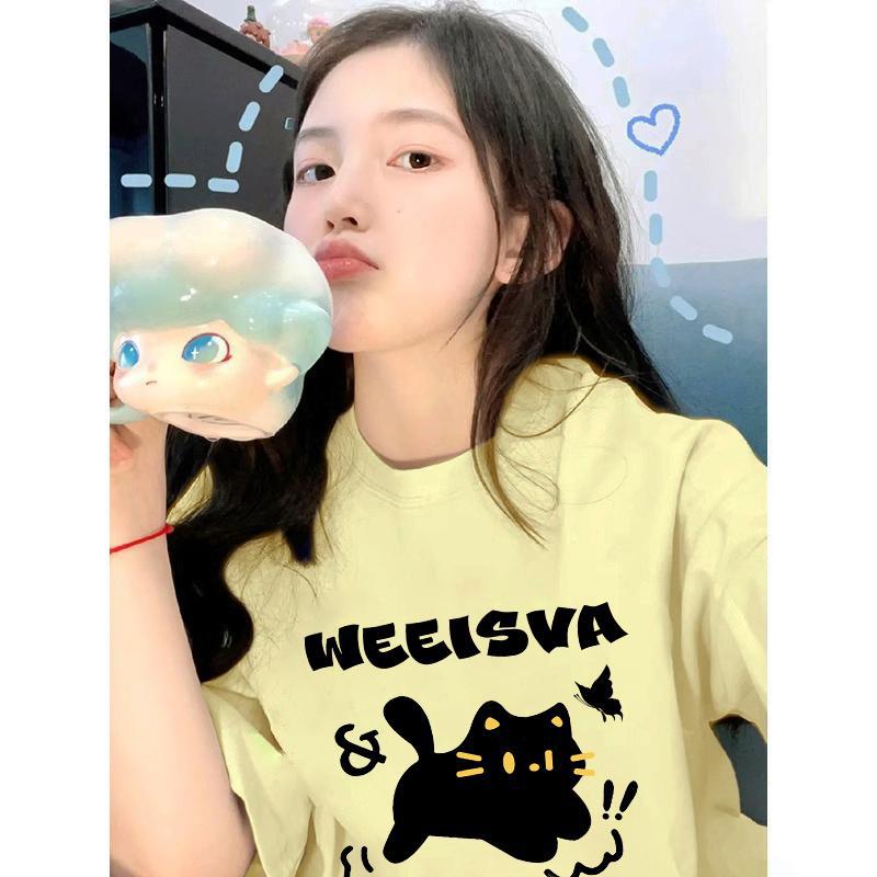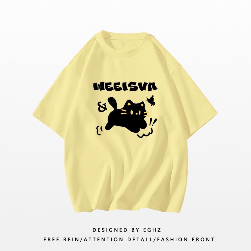 嫩黄色短袖t恤女新款夏季慵懒风设计感小众重磅纯棉正肩上衣