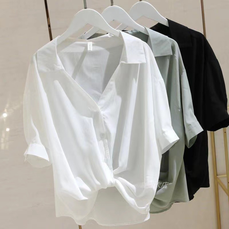 v领衬衫短袖女夏季新款韩版宽松显瘦百搭内搭雪纺薄款上衣潮