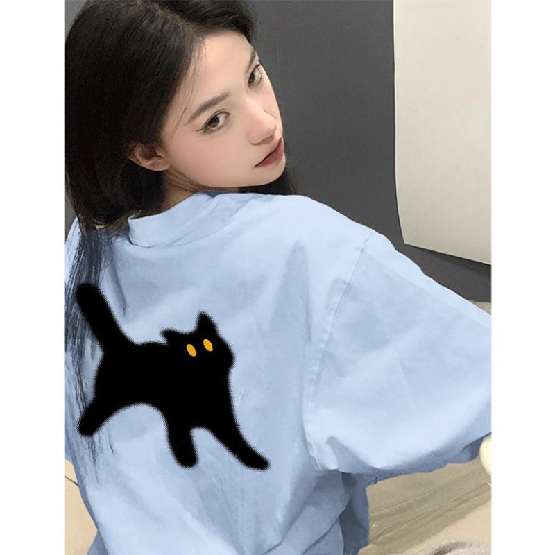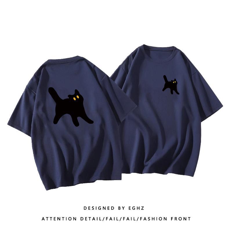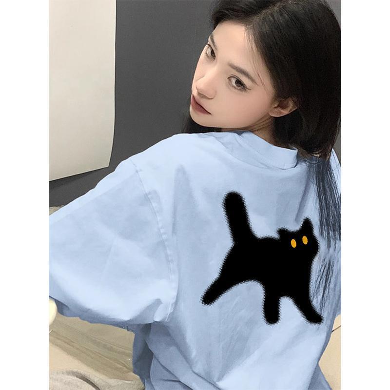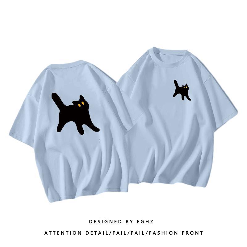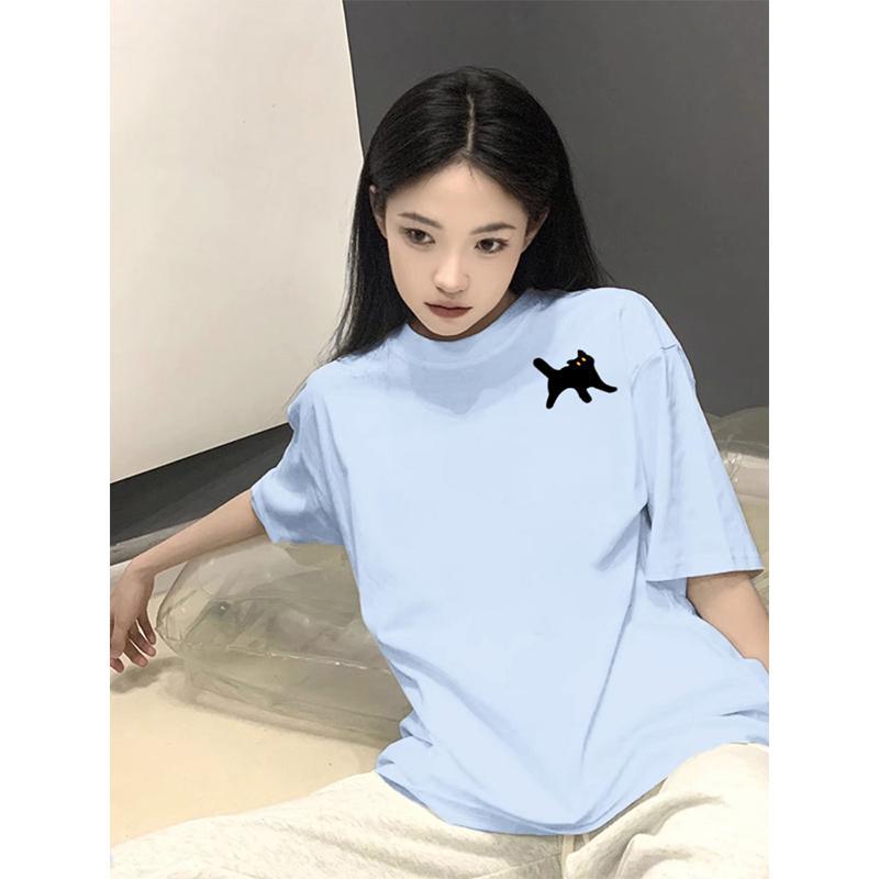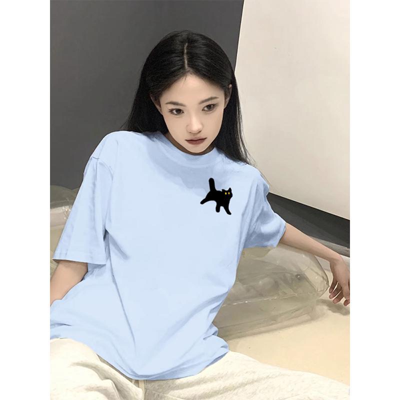 蓝色圆领短袖T恤女夏季爆款新款多巴胺宽松休闲潮牌纯棉上衣