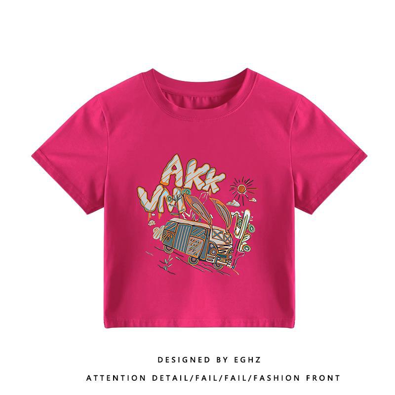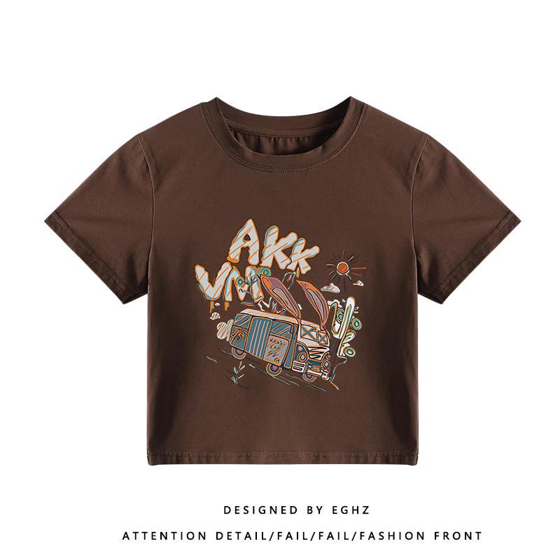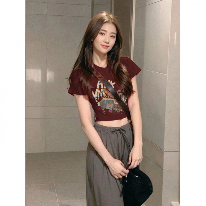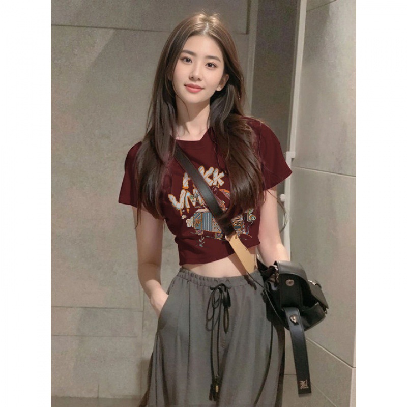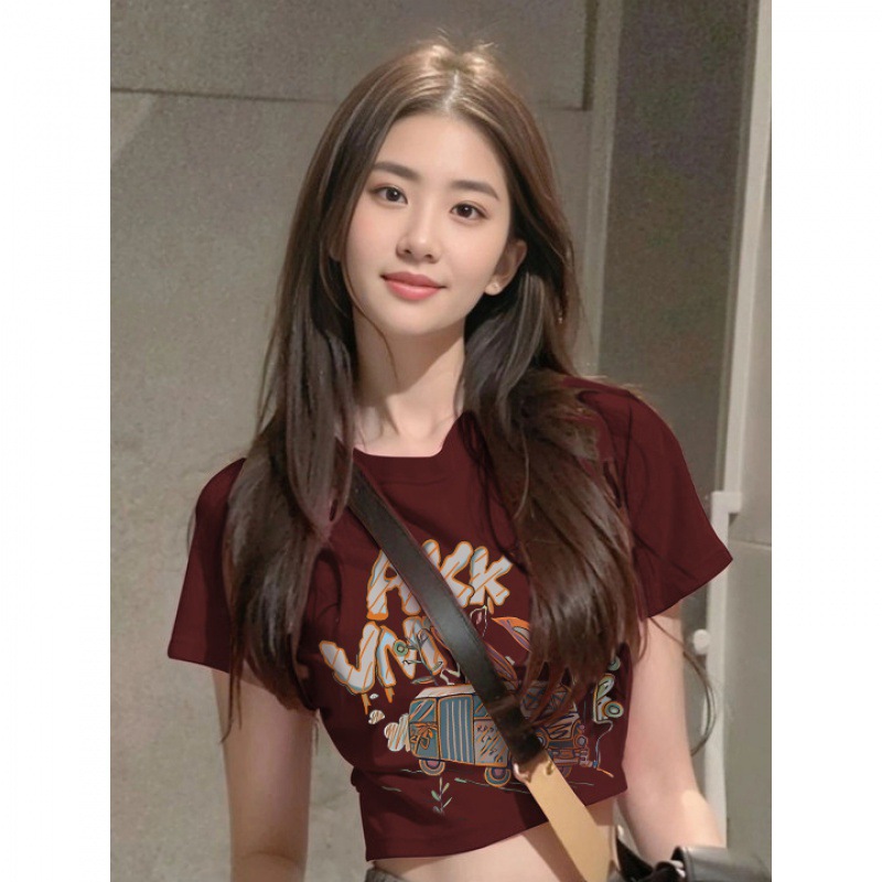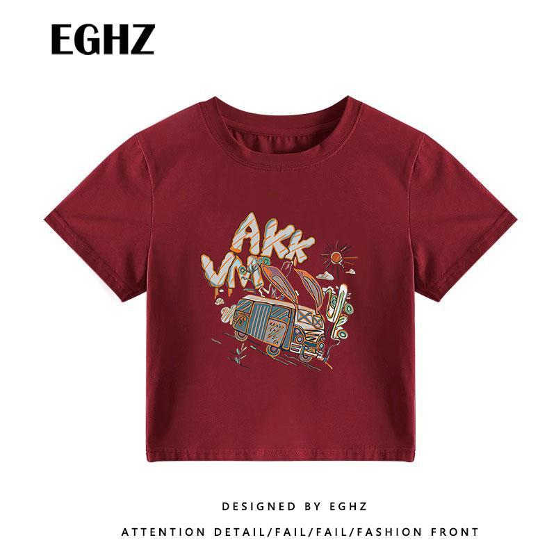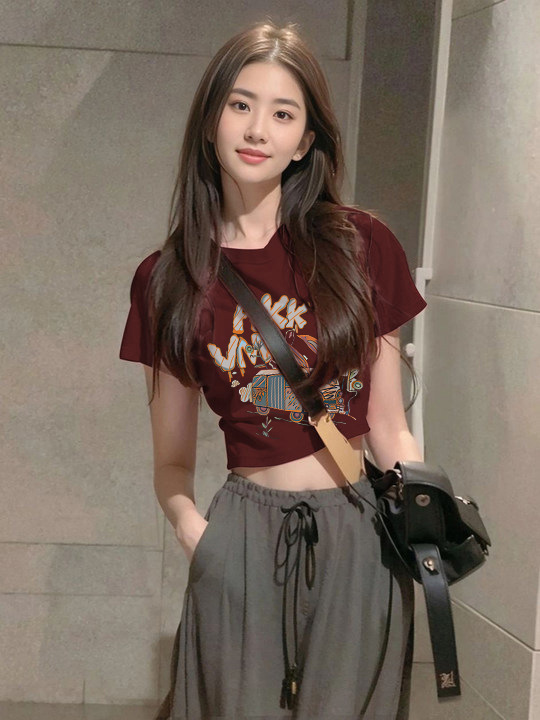 美式酒红色正肩t恤女短袖夏季设计感小众独特别致甜辣妹bm短上衣