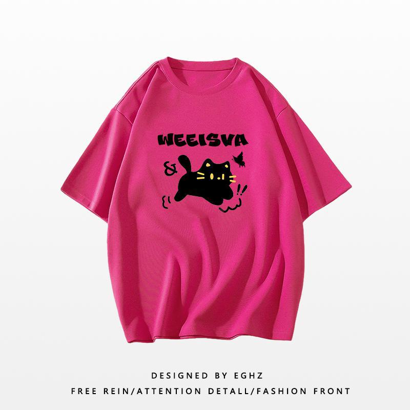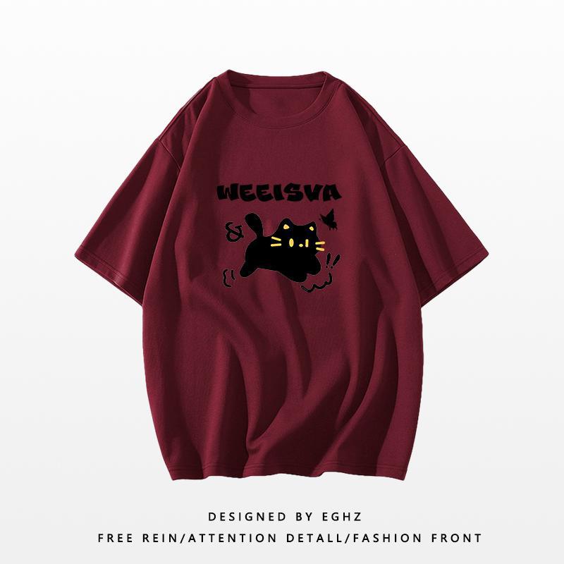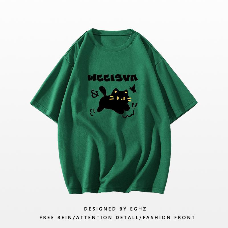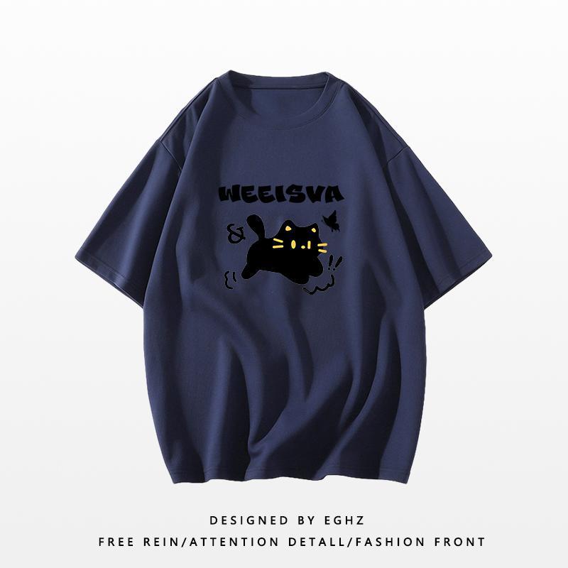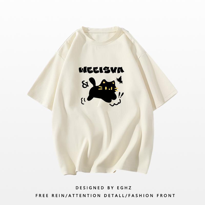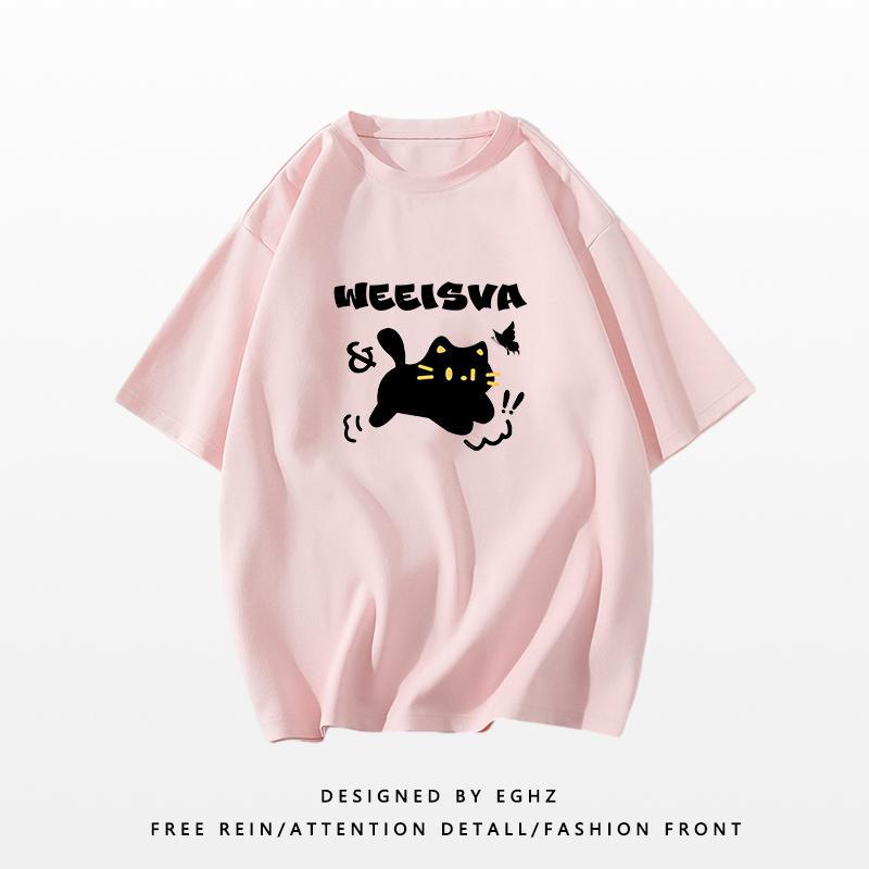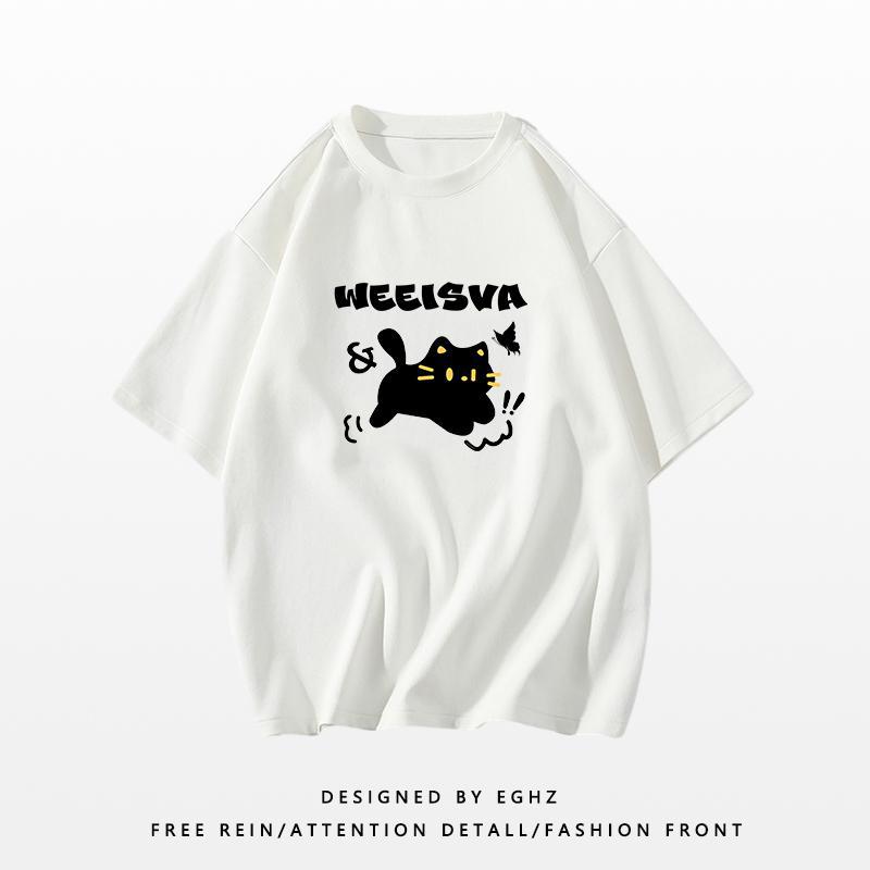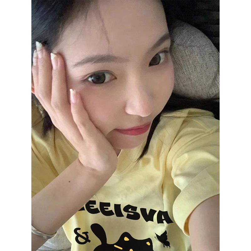 新款短袖女t恤夏季宽松独特别致猫咪印花减龄超好看圆领上衣