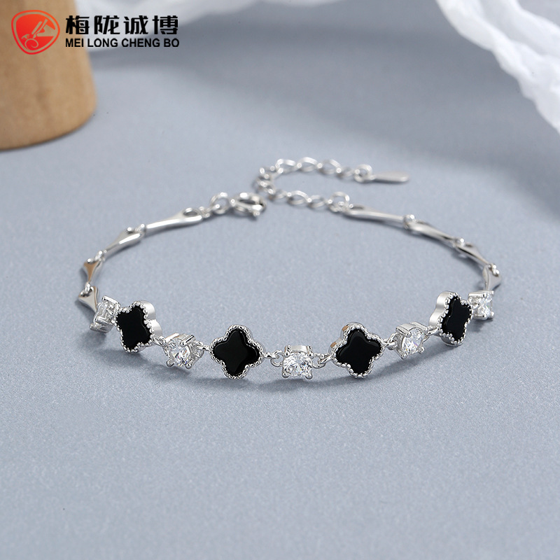 925纯银小清新四叶草手链女新款时尚黑玛瑙手饰简约ins气质手饰品