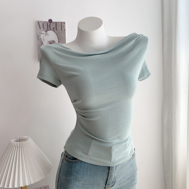 夏季褶皱不规则螺纹露肩荡领短袖T恤小众设计感纯欲辣妹上衣