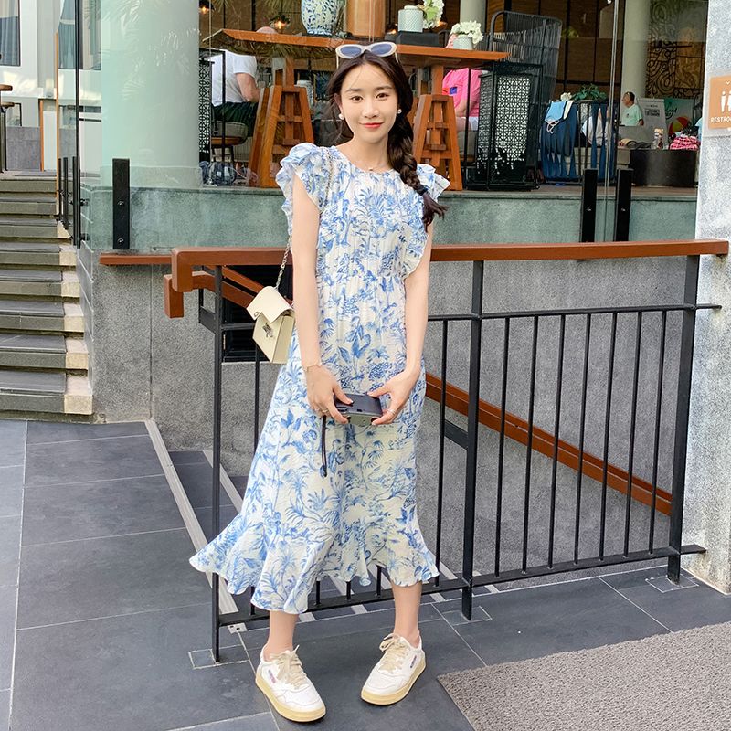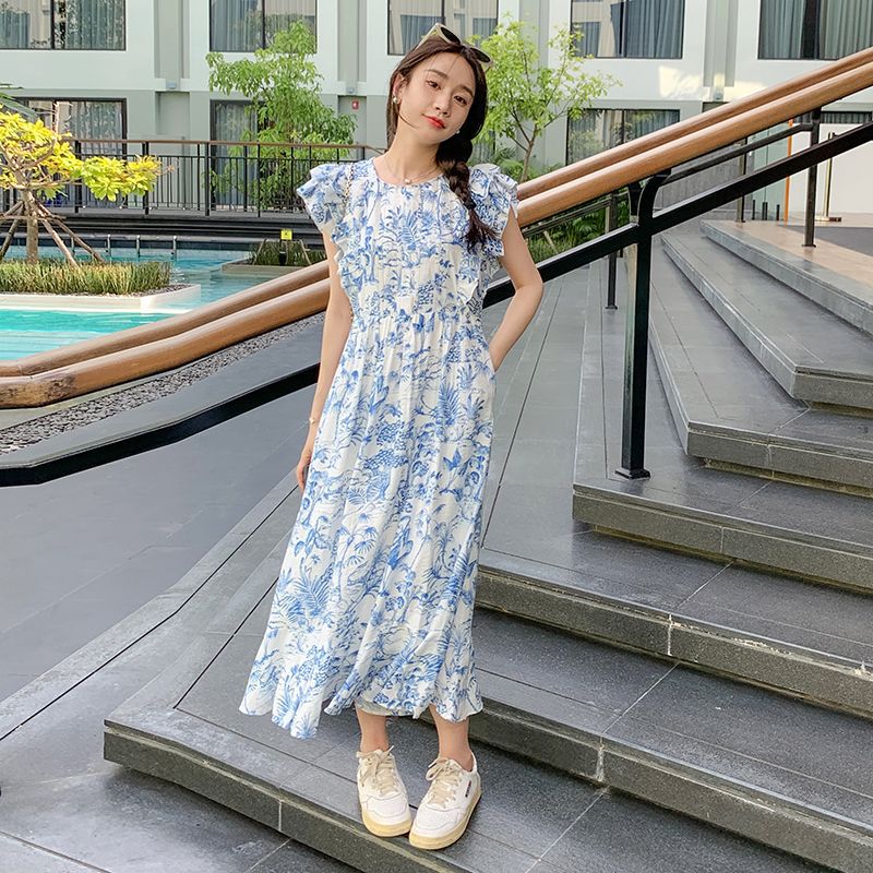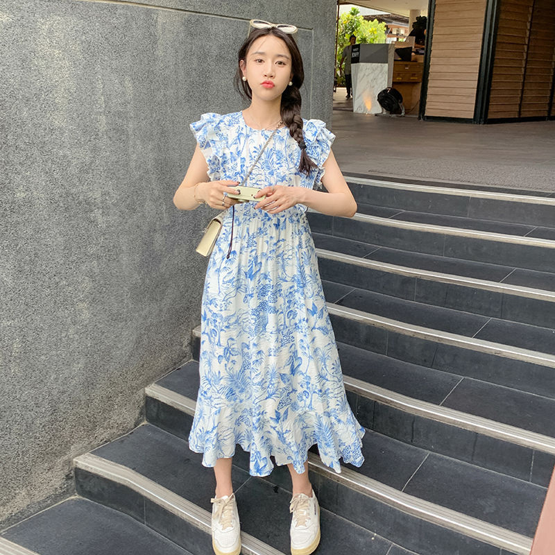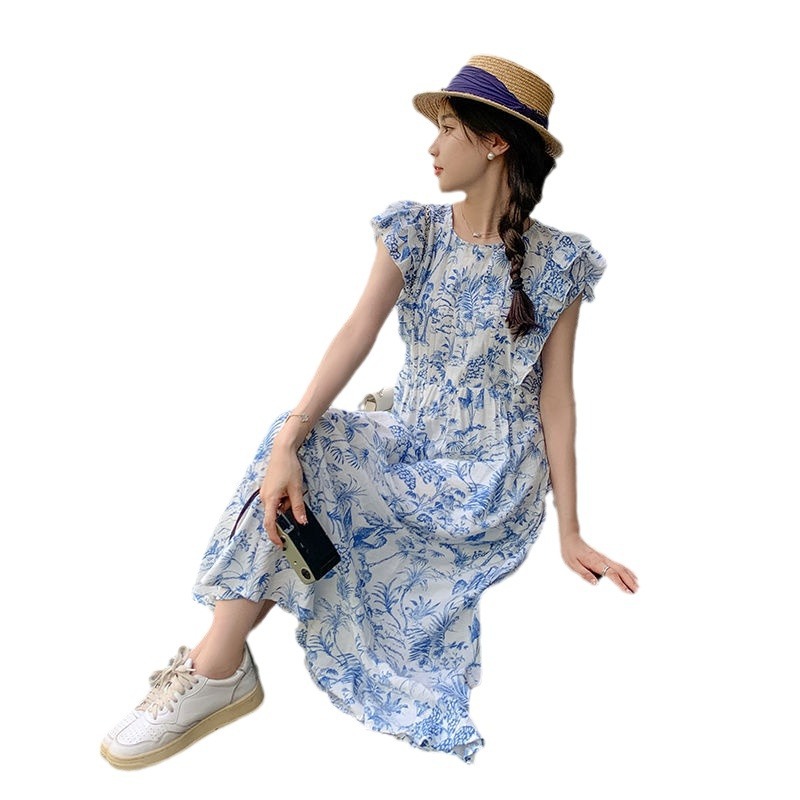 小清新水墨印花连衣裙女夏新款小众设计飞飞袖别致夏季碎花裙