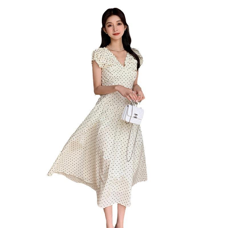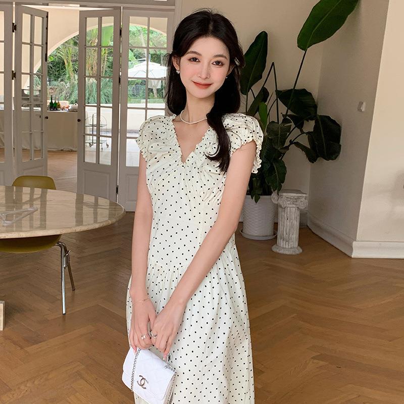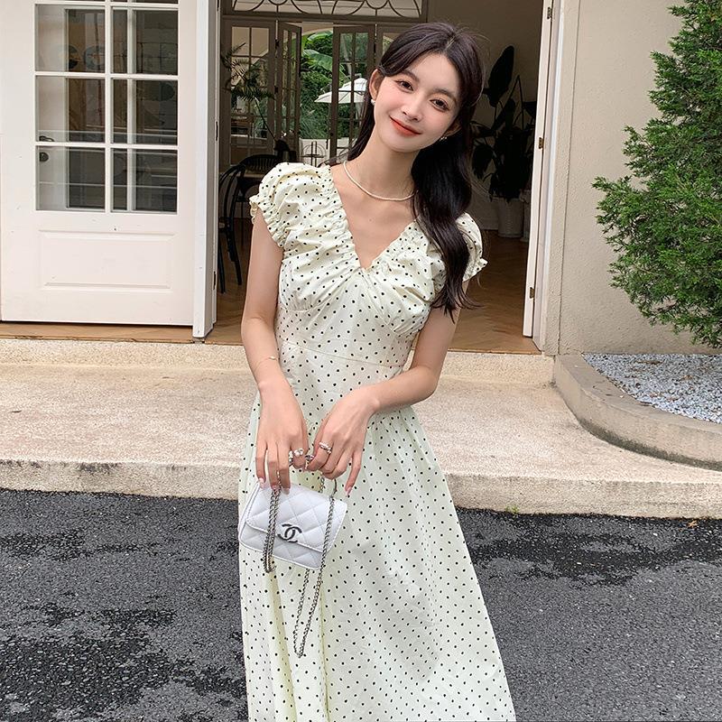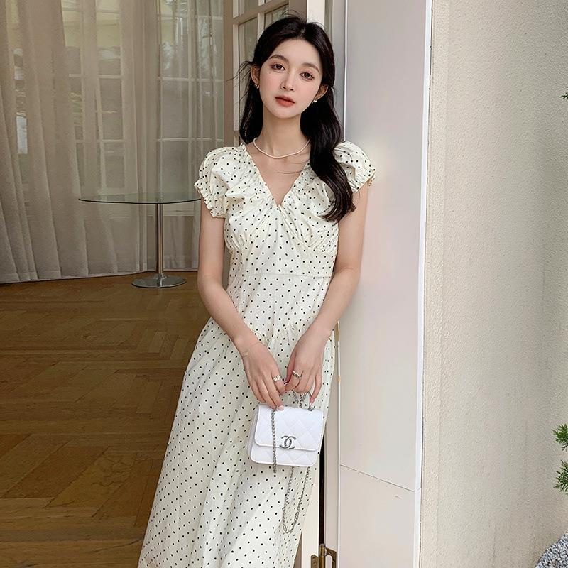 实拍轻复古泡泡袖两穿压褶V领法式波点收腰显瘦A字裙摆长款连衣裙