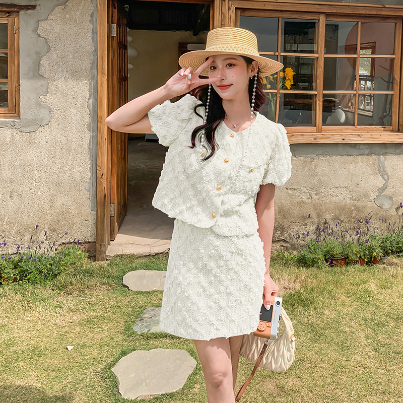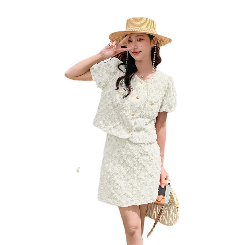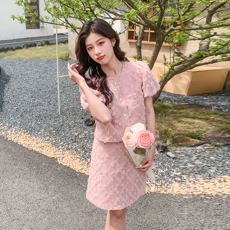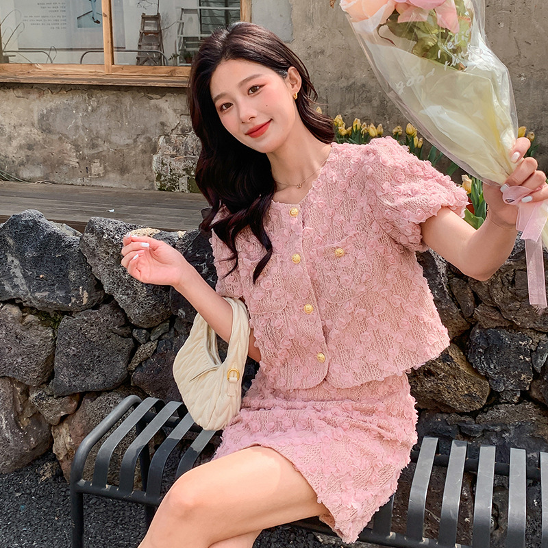 夏季粉色小香风气质泡泡袖时尚短袖套装女年新款提花时尚套裤