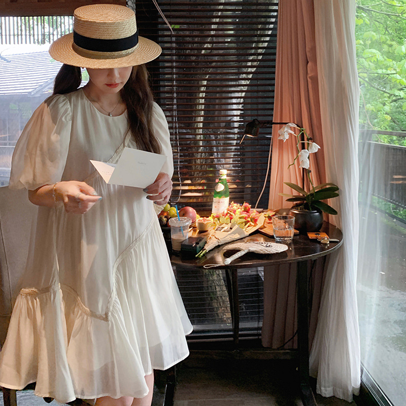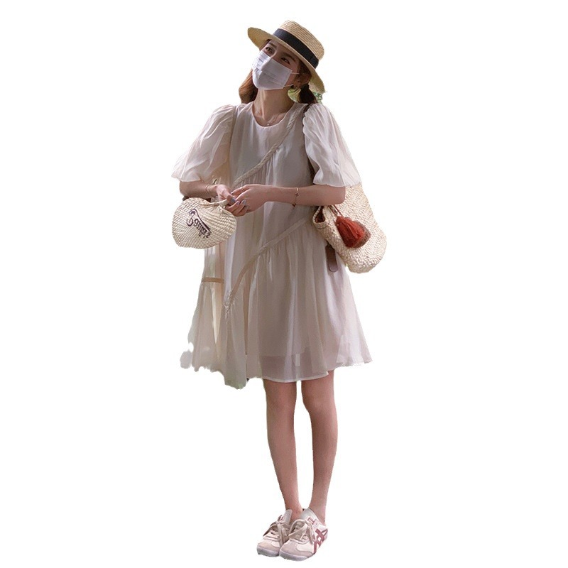 法式米白色桔梗连衣裙女夏季新款甜美减龄宽松泡泡袖公主裙子