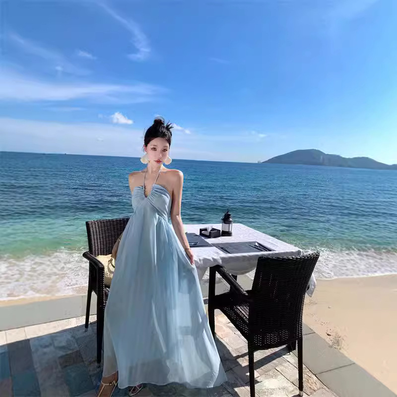 夏季度假风浅蓝格纹吊带度假连衣裙小众森系精致仙女唯美长裙