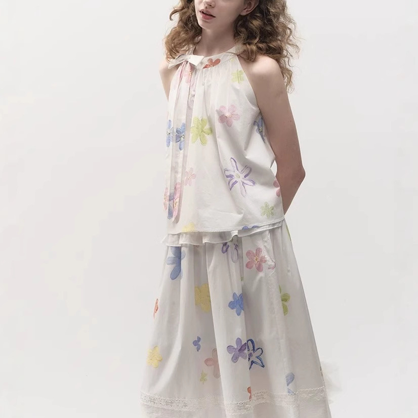 夏季设计感印花蝴蝶结挂脖上衣a字半身裙套装