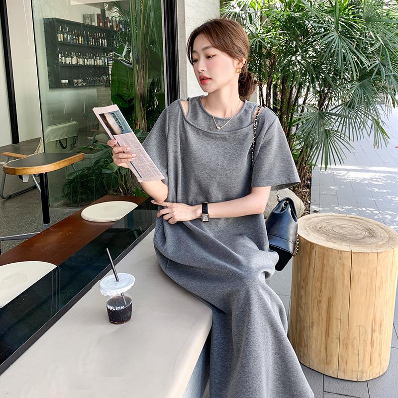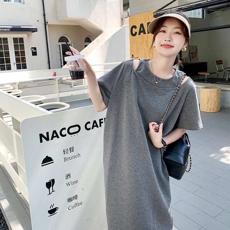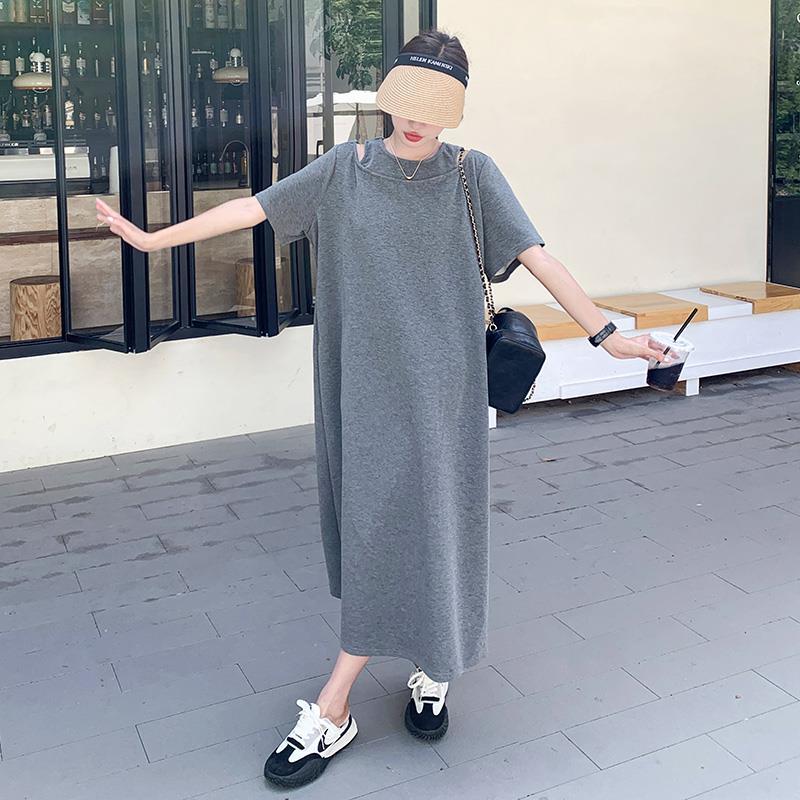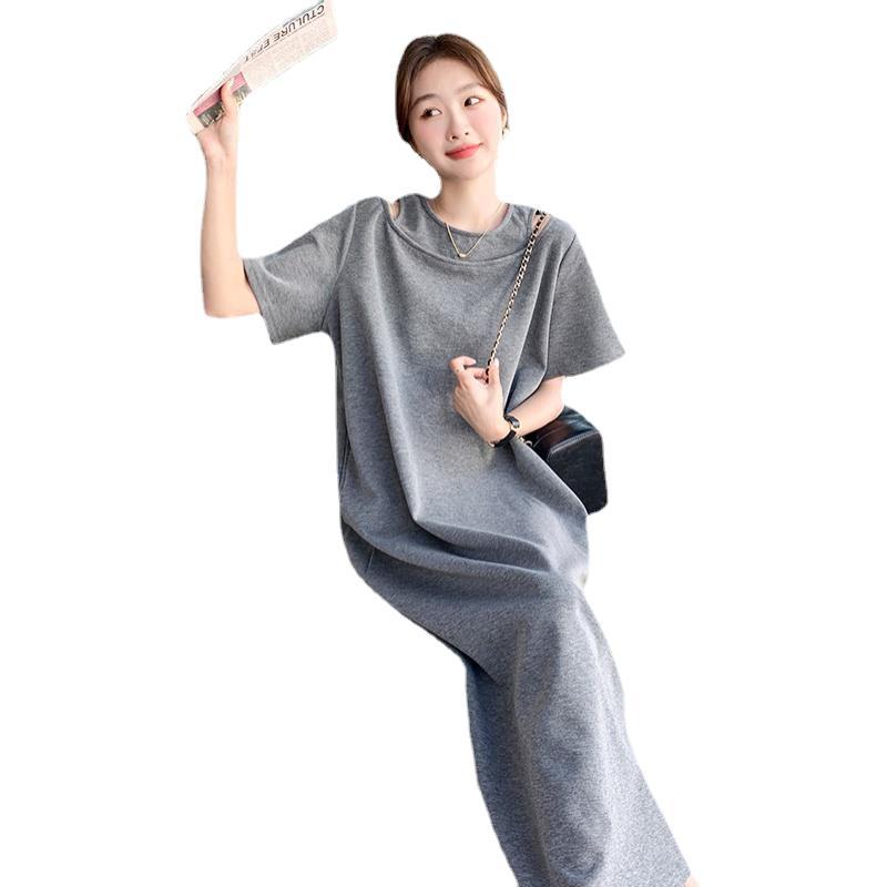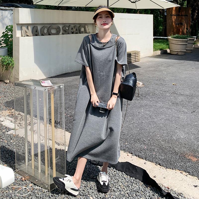 爆款炸街灰色T恤连衣裙女年夏季新款设计感小众宽松显瘦长裙