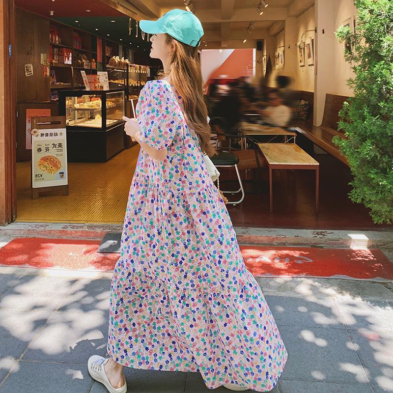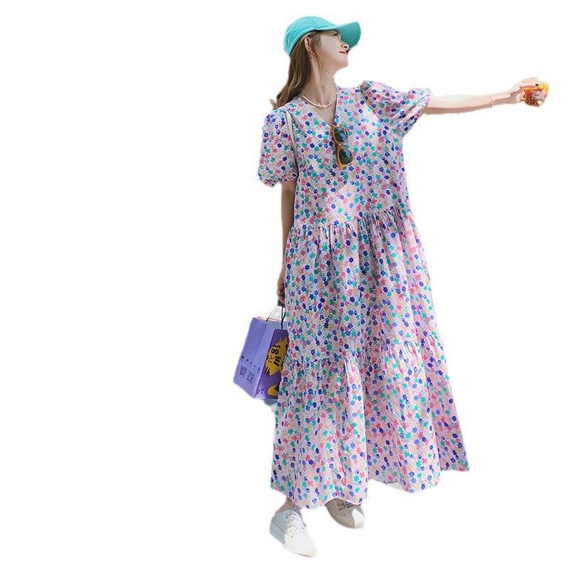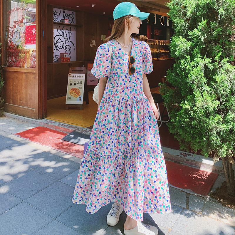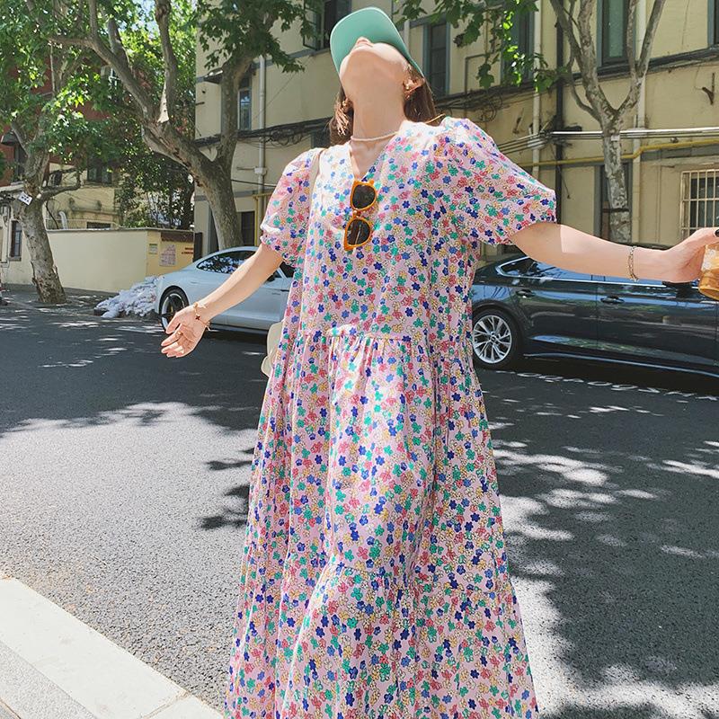 实拍ins彩色碎花V领泡泡袖少女感宽松减龄拼接裙摆系带收腰连衣裙