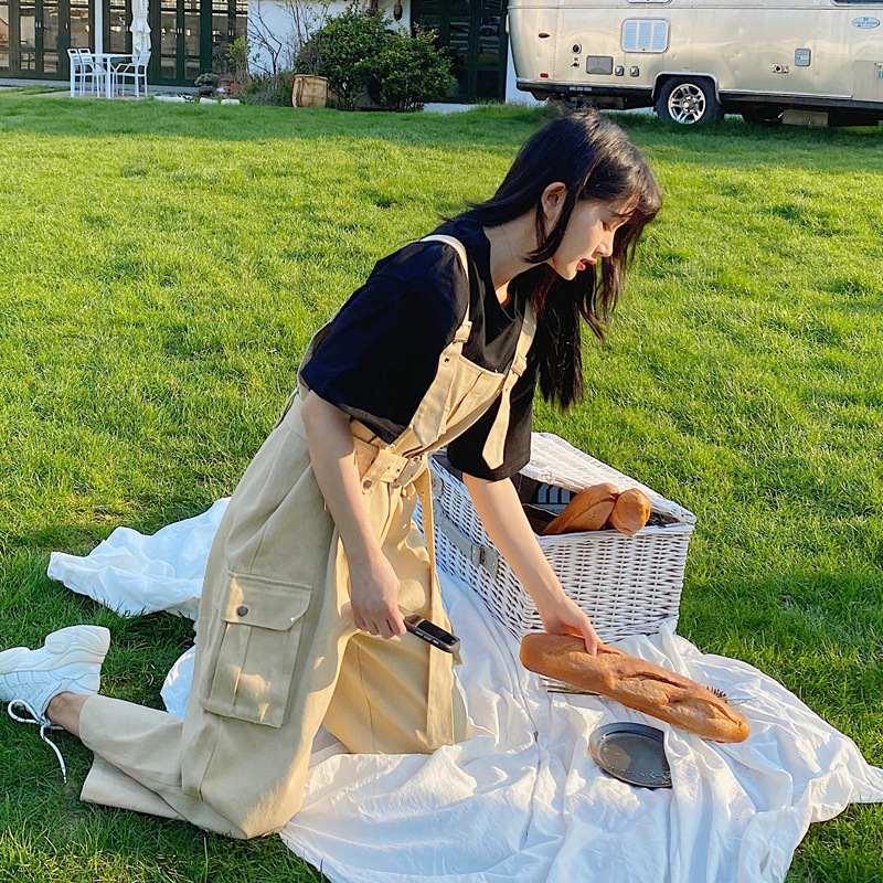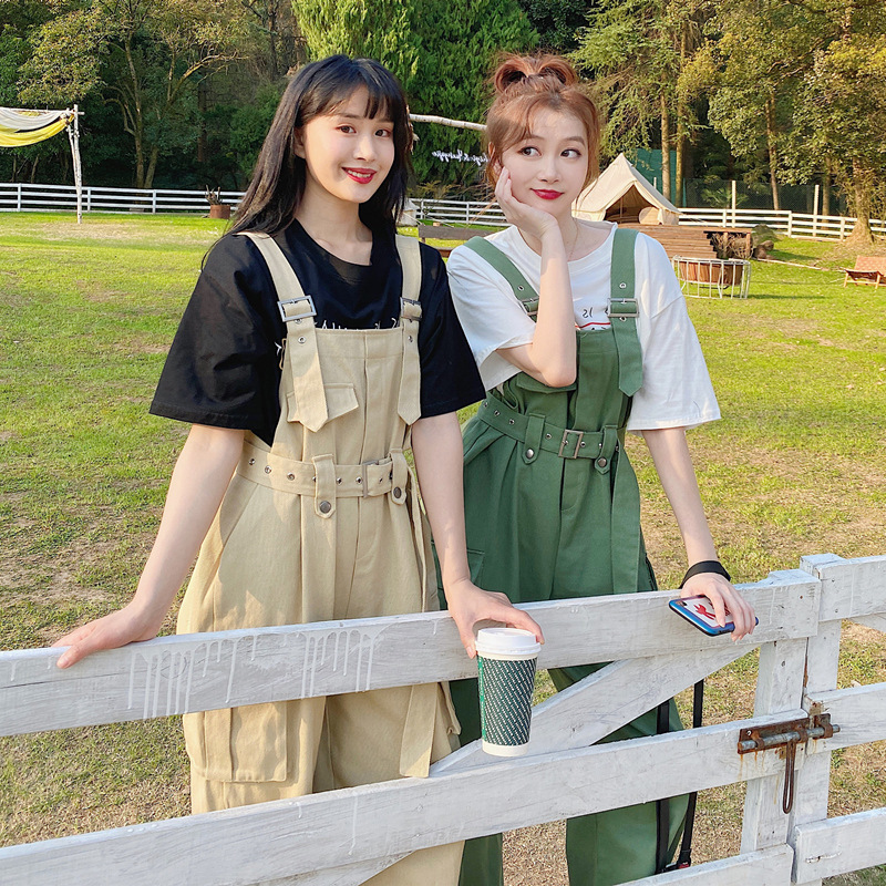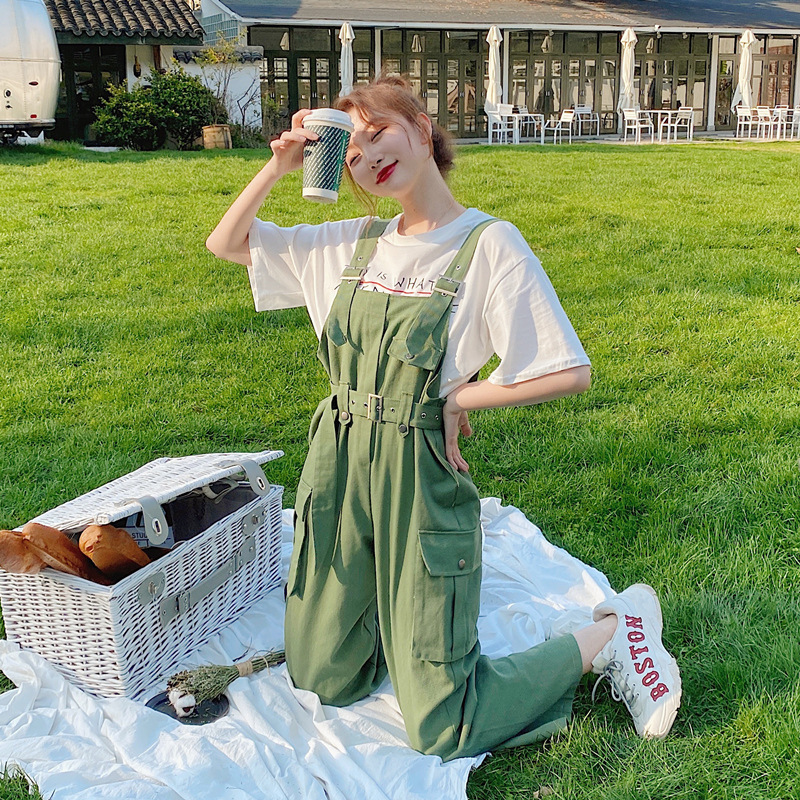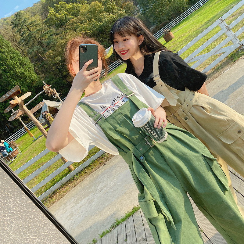 实拍工装高腰军绿色背带裤裤女夏季新款森女系宽松阔腿背带裤