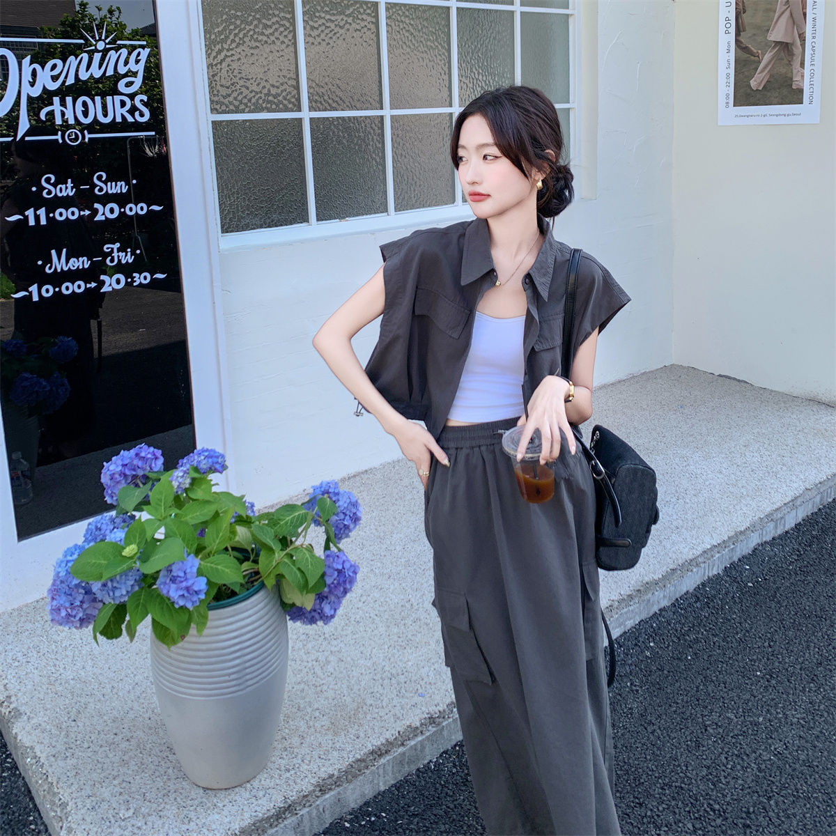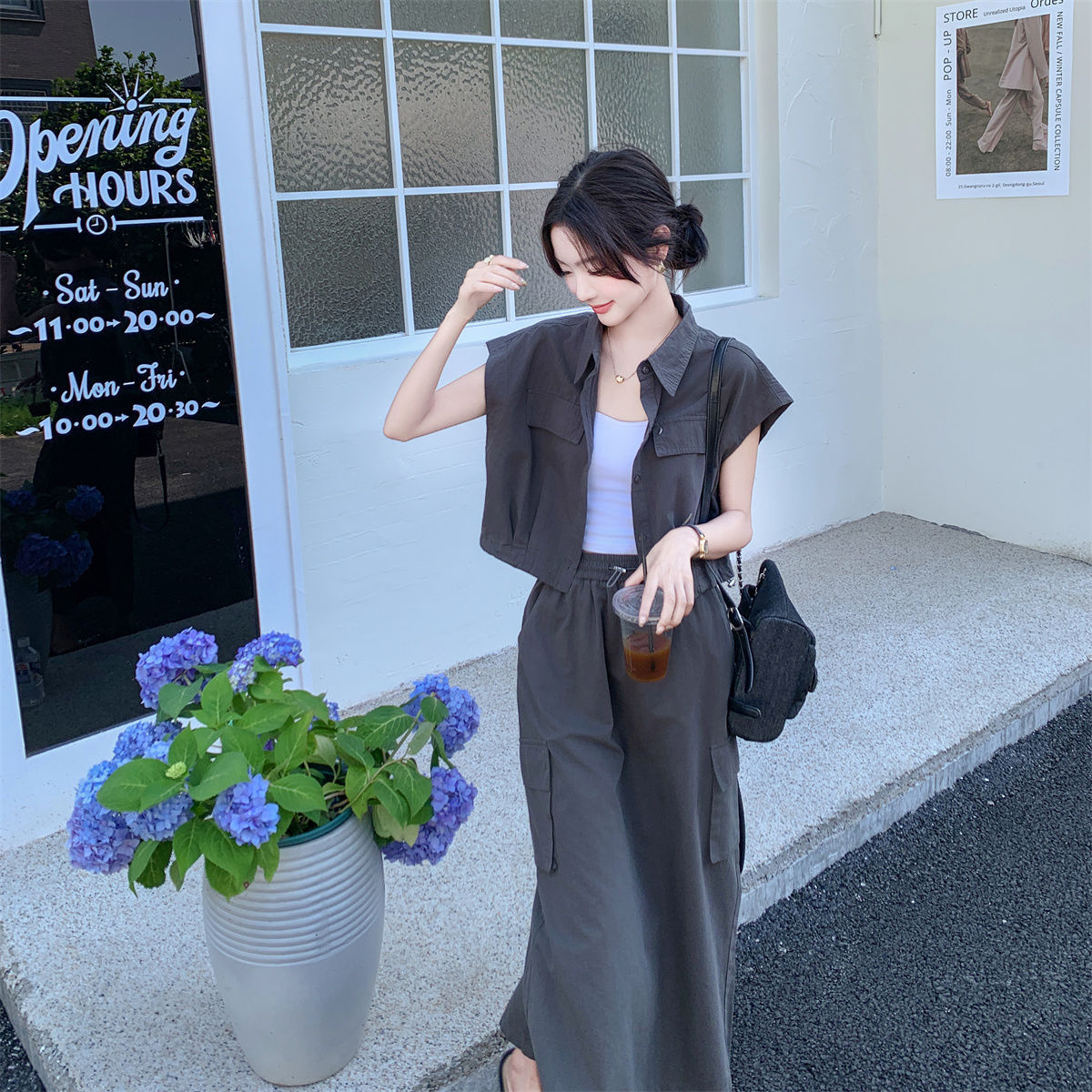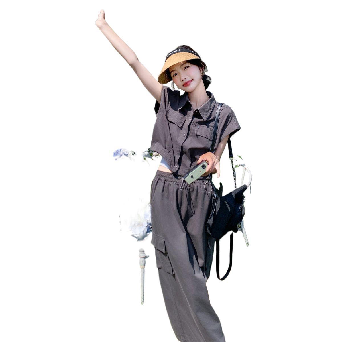 灰色工装风套装裙女夏新款韩版今年流行衬衫上衣半身裙两件套