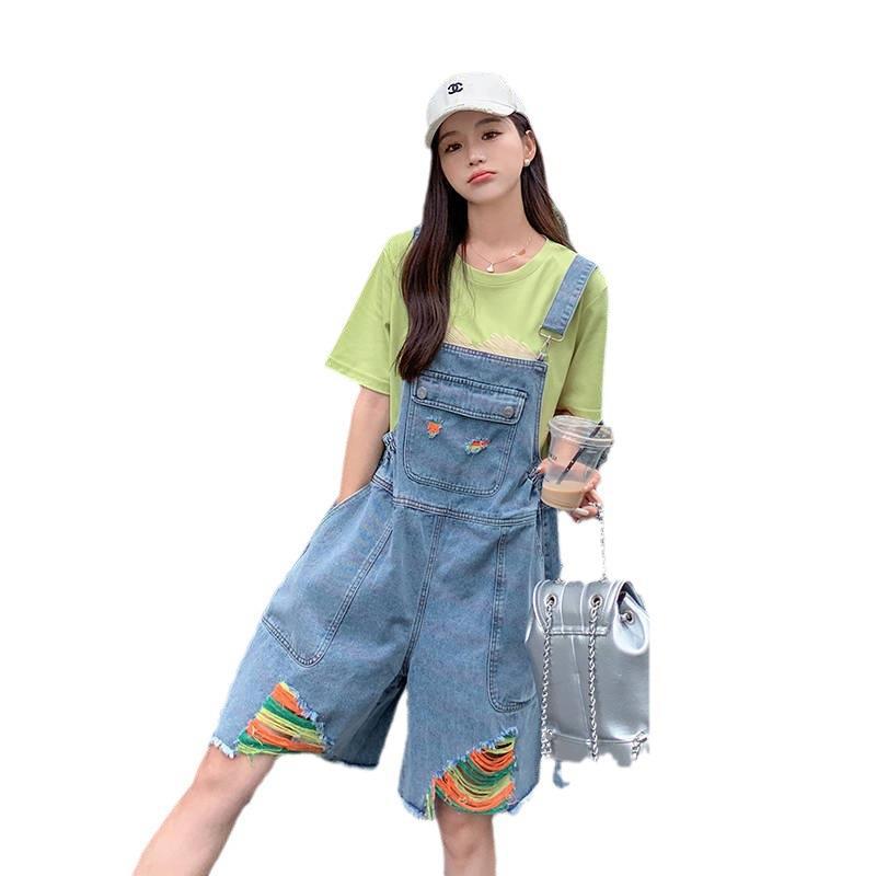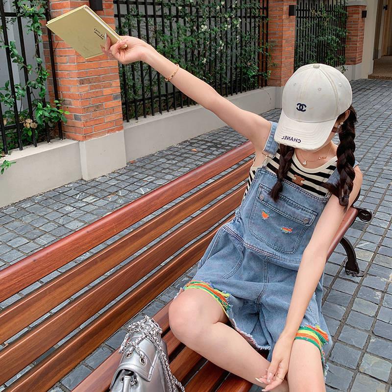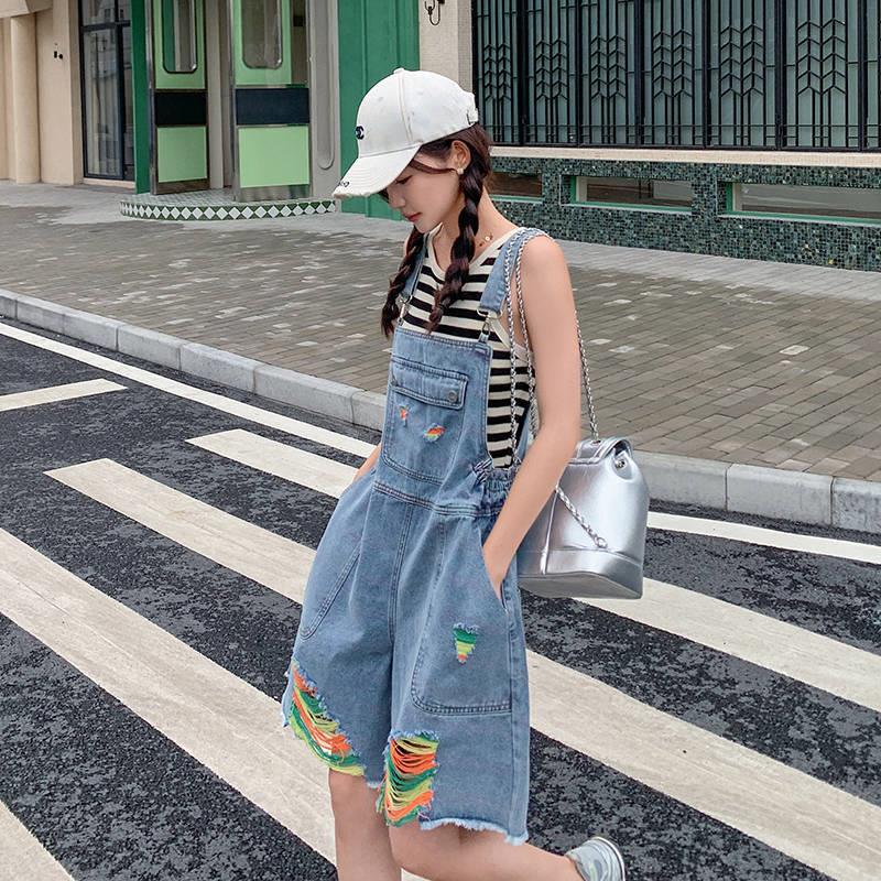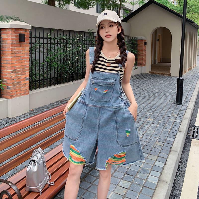 实拍轻复古拼接口袋多巴胺彩色纱线破洞设计显瘦阔腿牛仔背带裤女