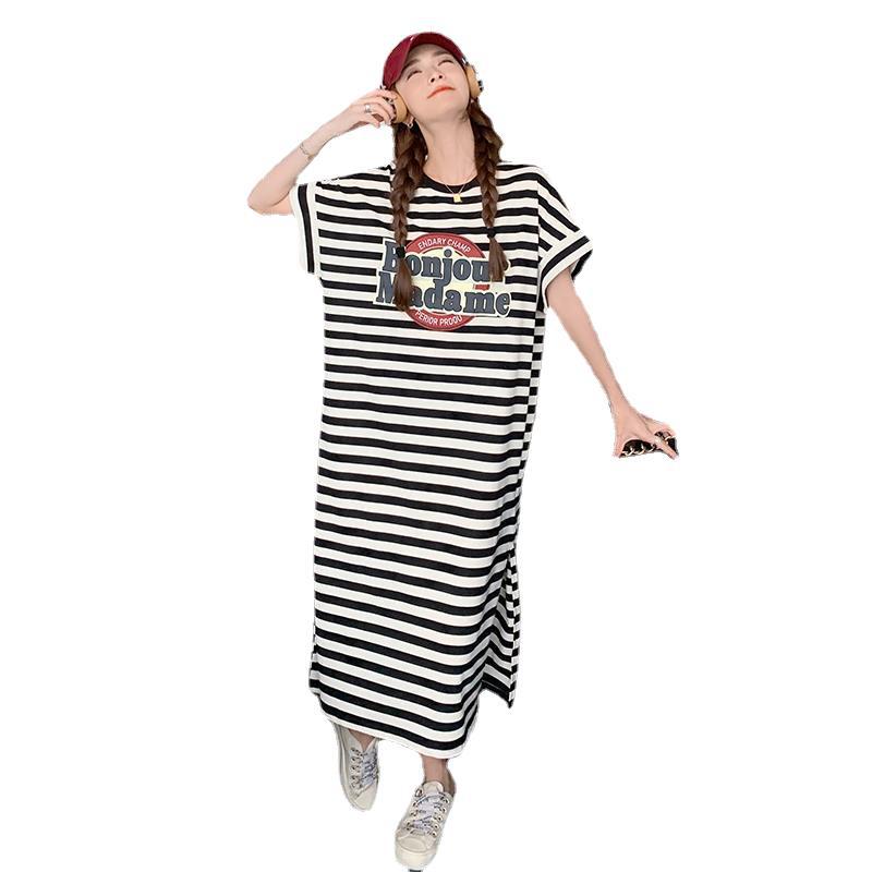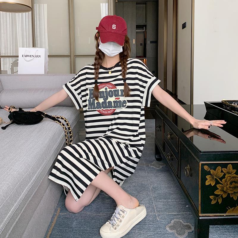 条纹T恤连衣裙女夏季新款宽松慵懒风休闲卡通印花直筒卫衣裙