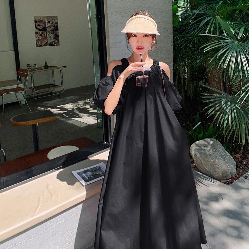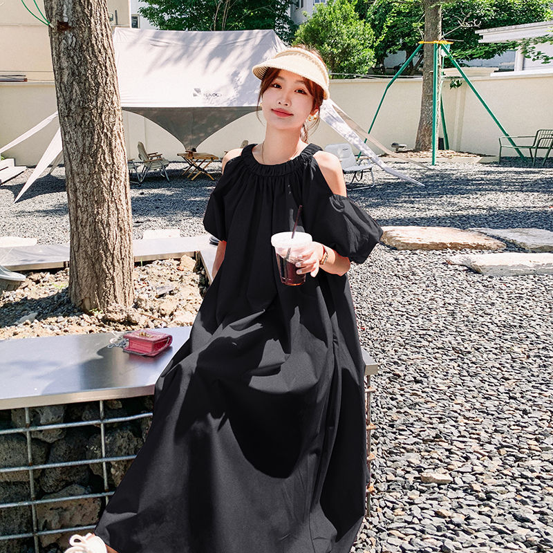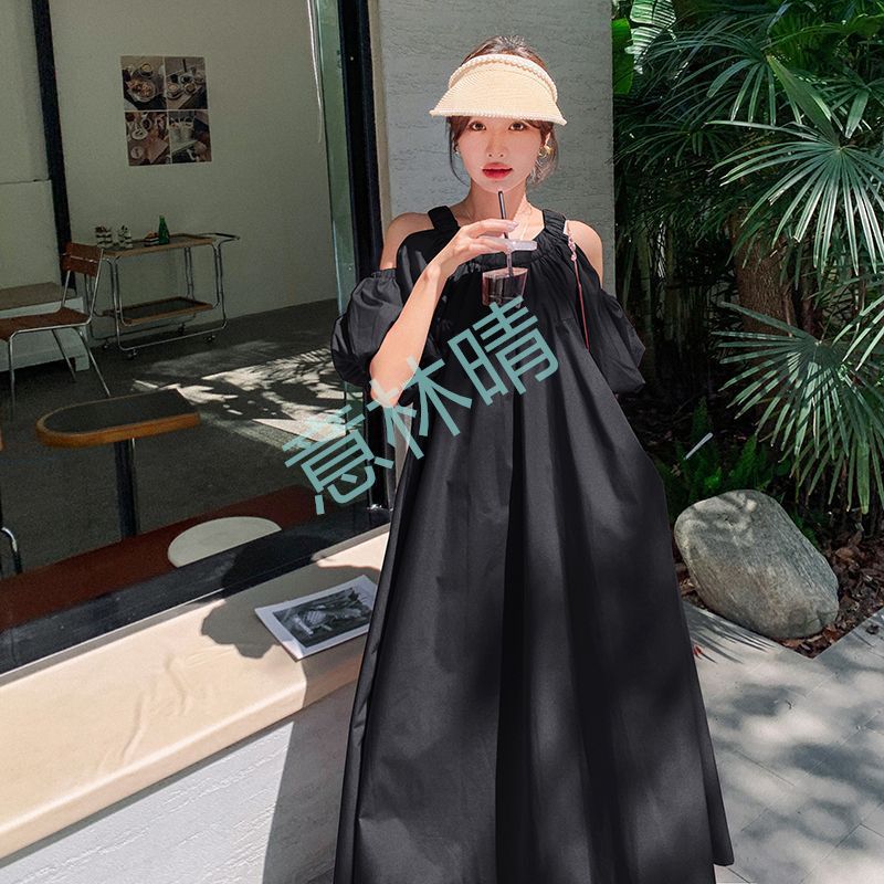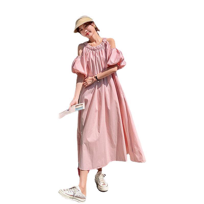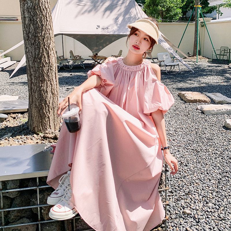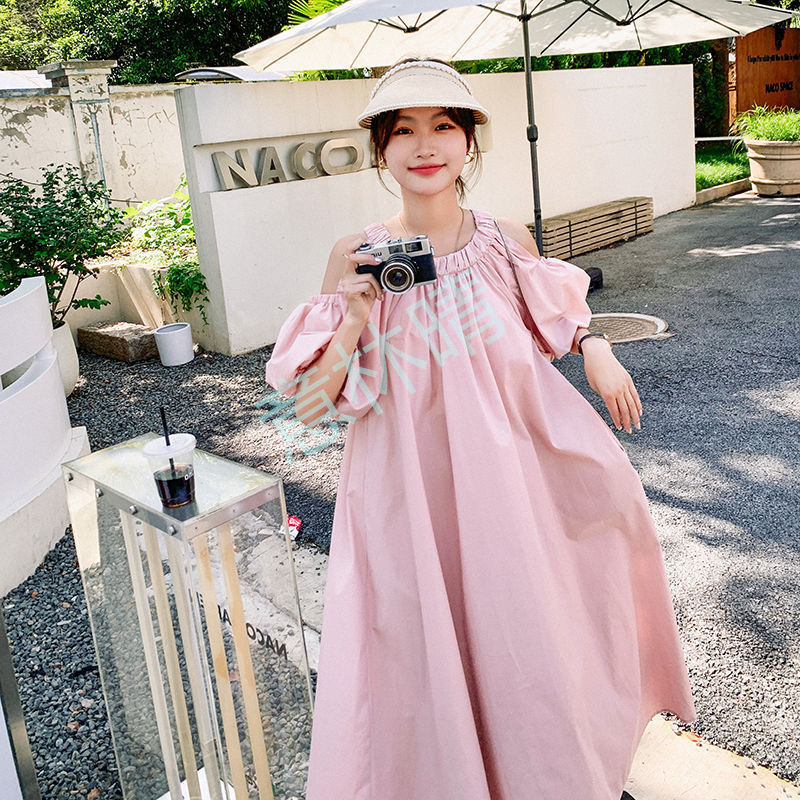 粉色露肩连衣裙女中长款夏新款法式宽松甜美慵懒风泡泡袖裙子