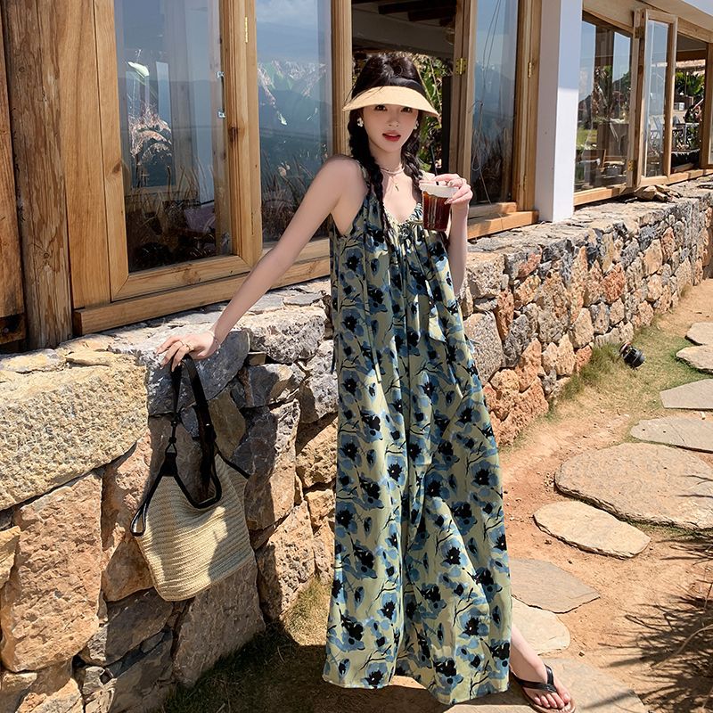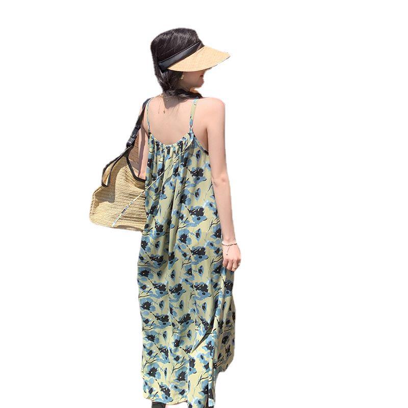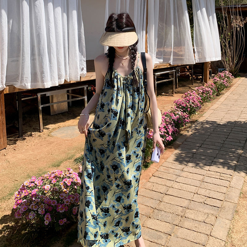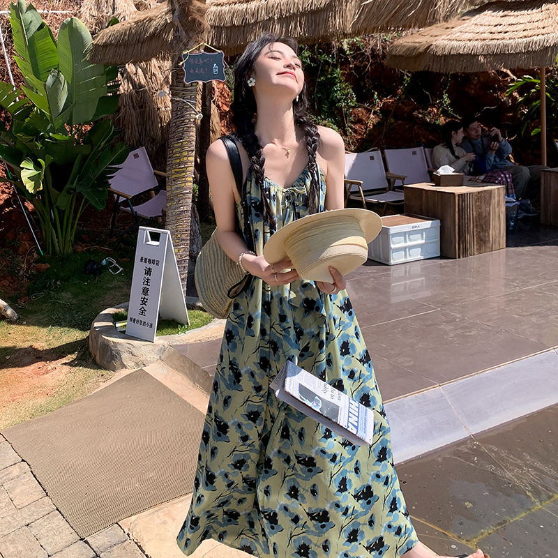 绿色度假风碎花吊带连衣裙女夏季新款法式气质复古设计感长裙