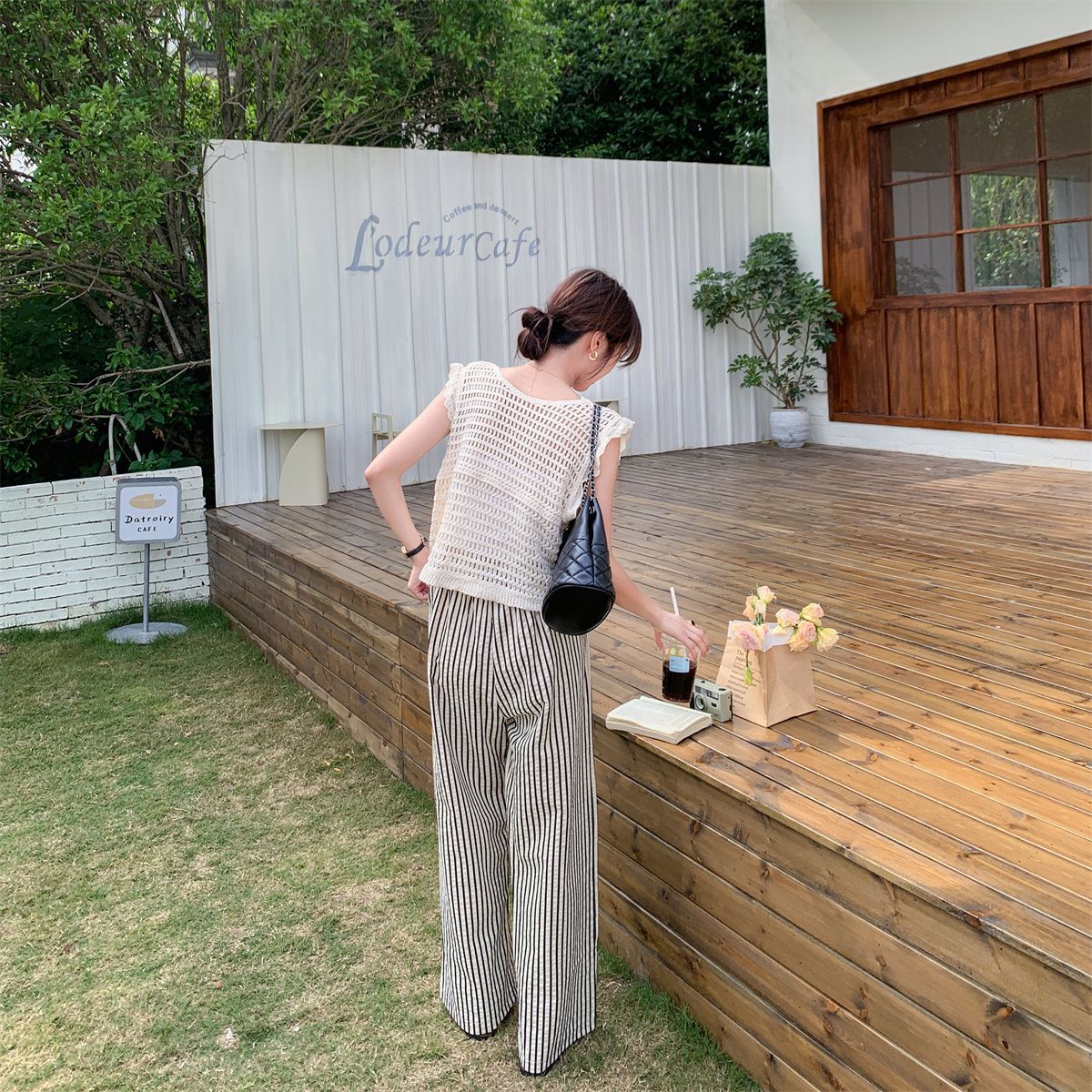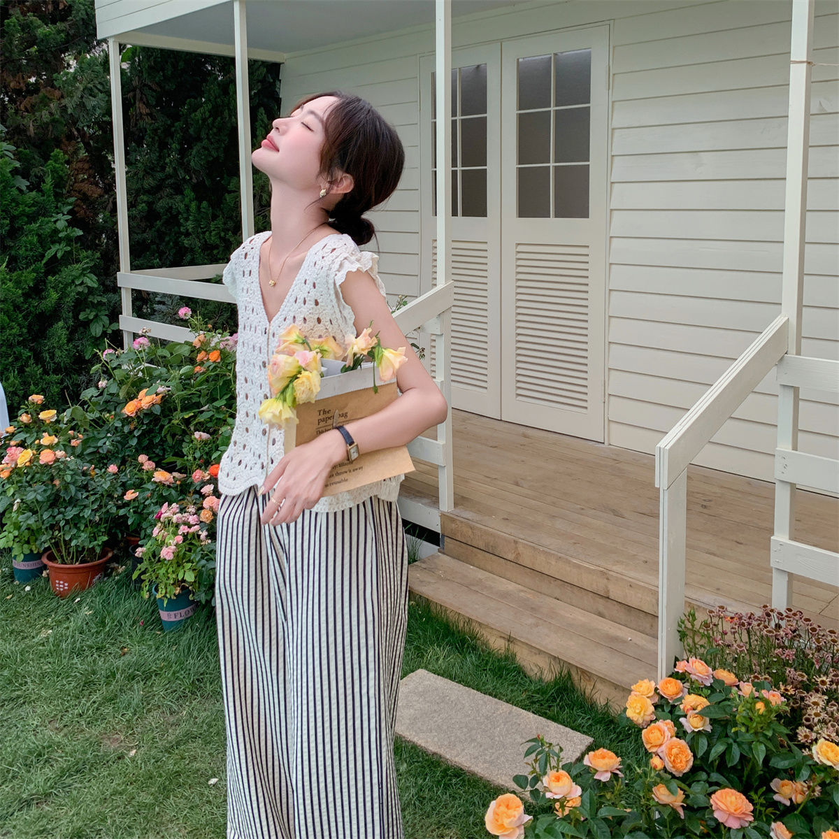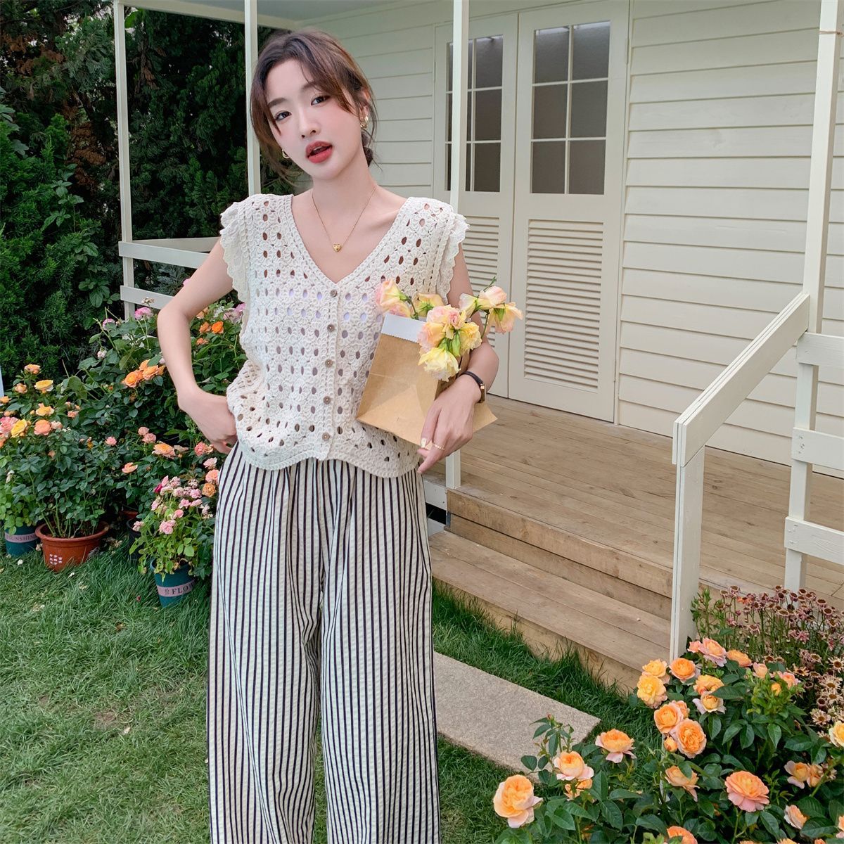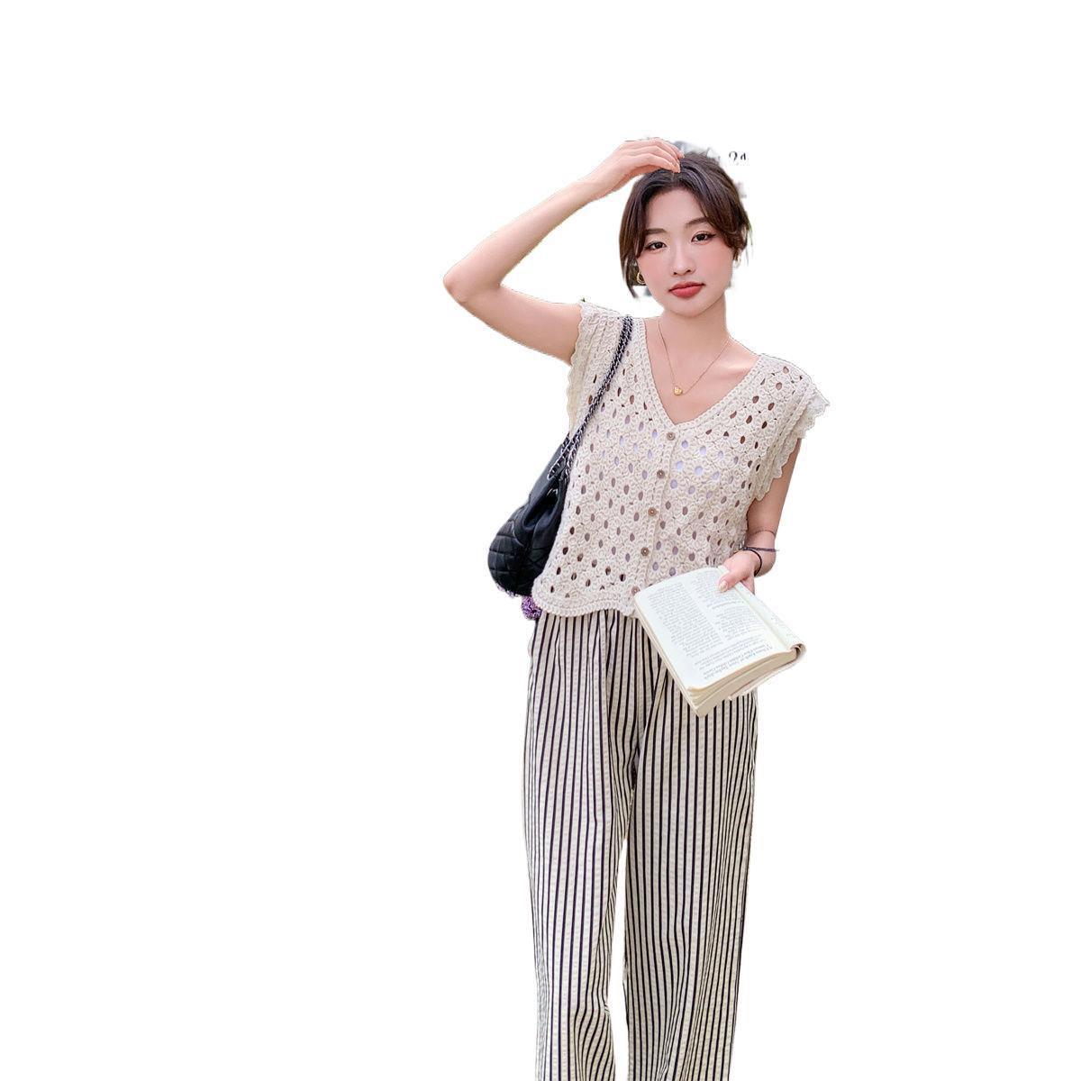 度假风休闲套装女夏季新款针织镂空马甲高腰条纹阔腿裤两件套