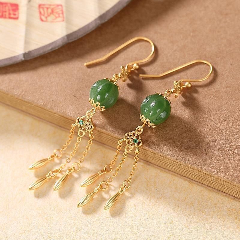 镀金色古风长款流苏耳环嵌仿和田玉碧玉耳坠女气质超仙复古耳钩礼