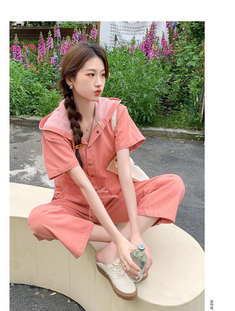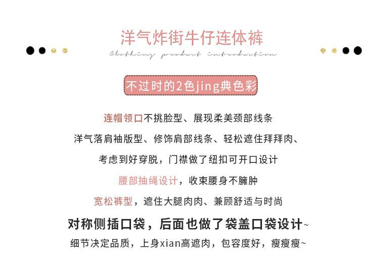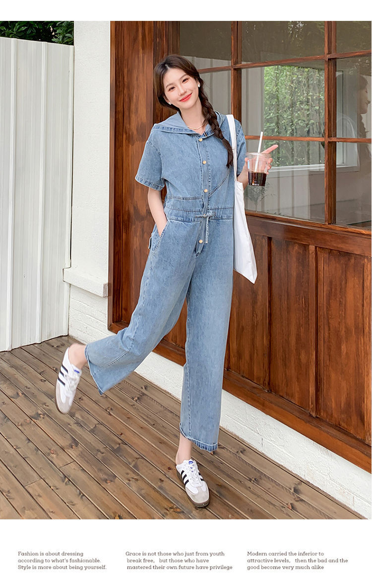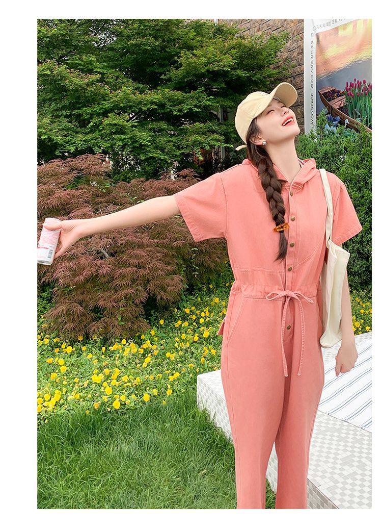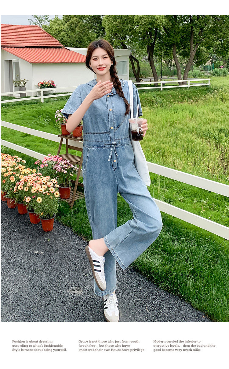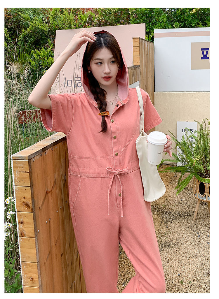 新款复古短袖款连帽牛仔连体裤女夏季休闲时髦炸街工装长裤子