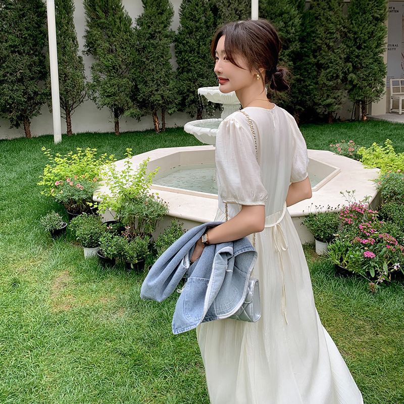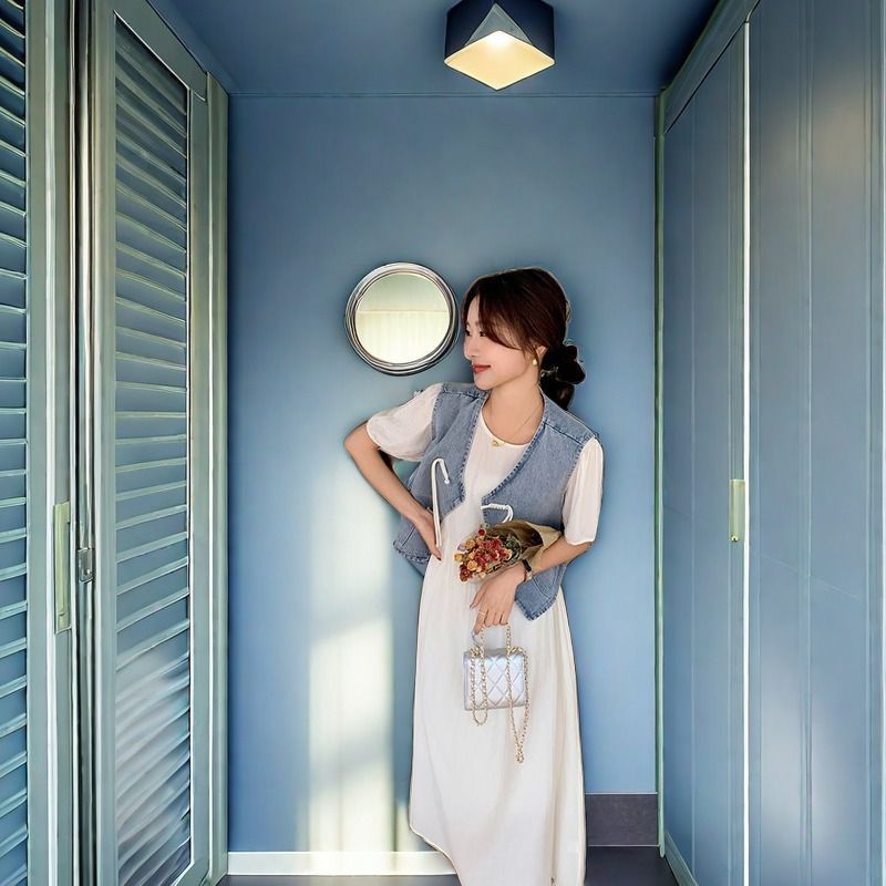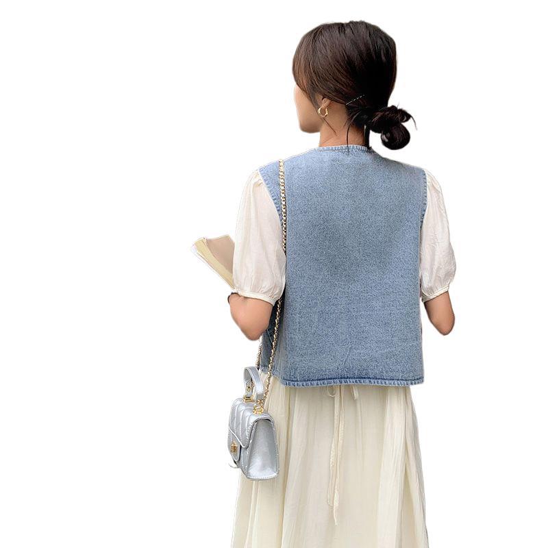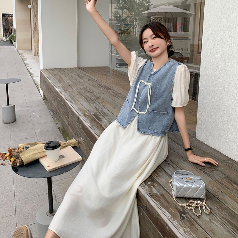 蓝色牛仔马甲连衣裙套装女夏新款国风新中式泡泡袖长裙两件套