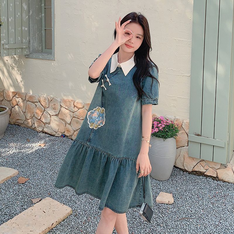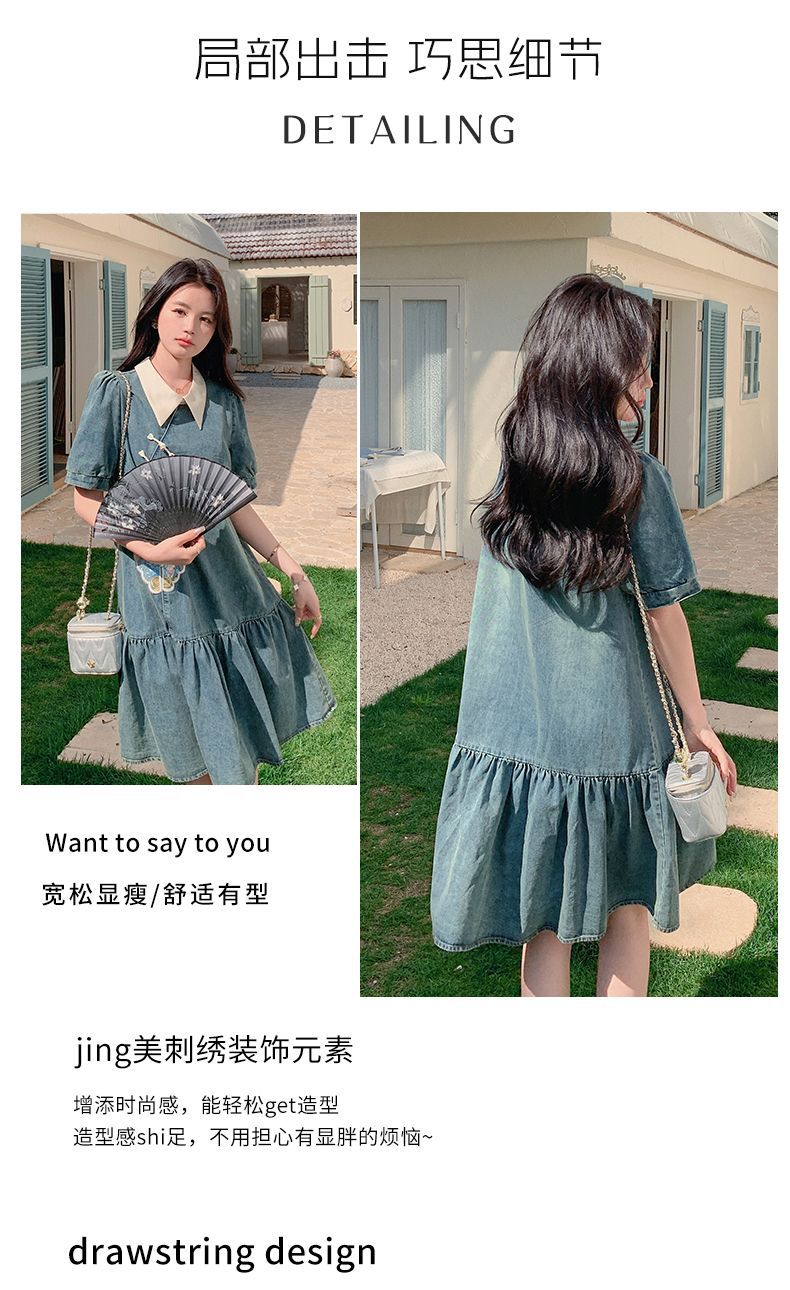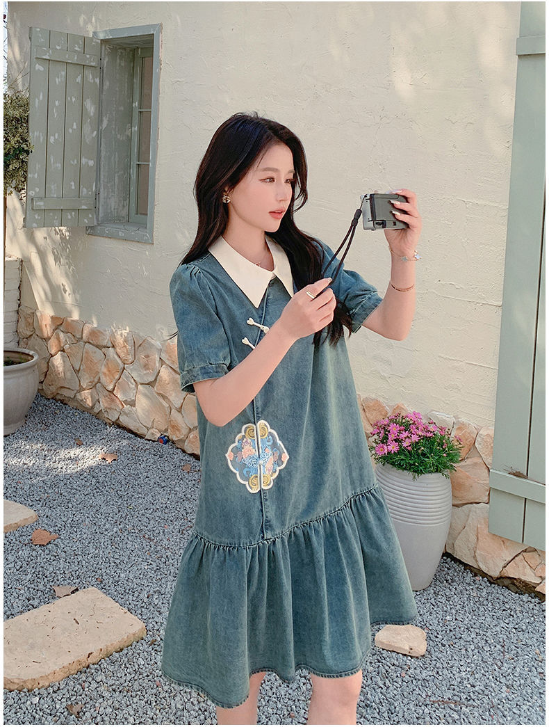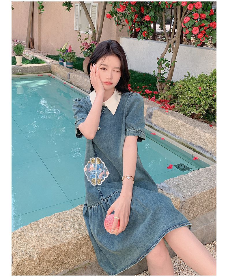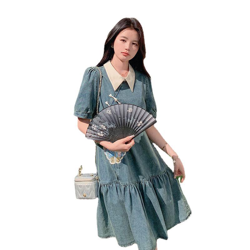 复古刺绣牛仔连衣裙女中长款夏新款国风显瘦减龄POLO领衬衫裙