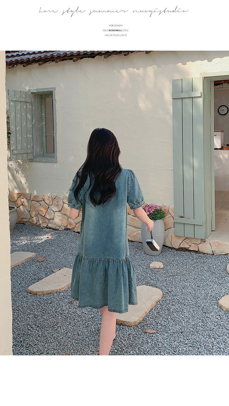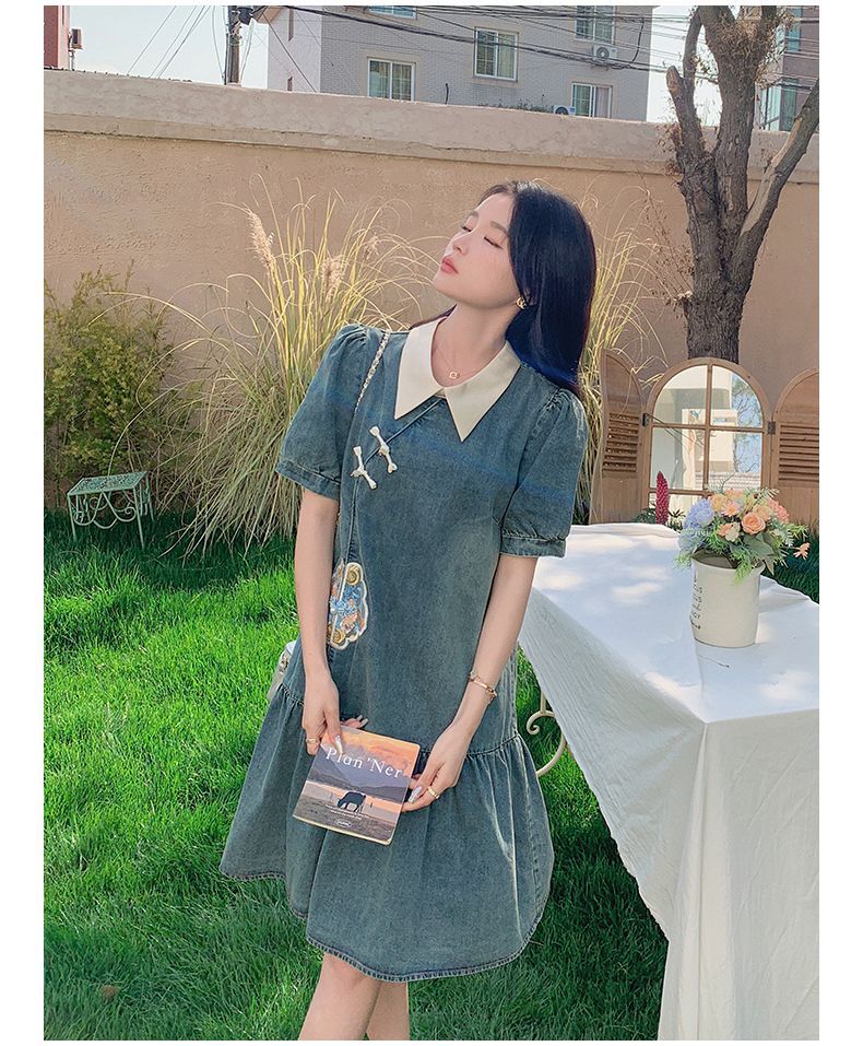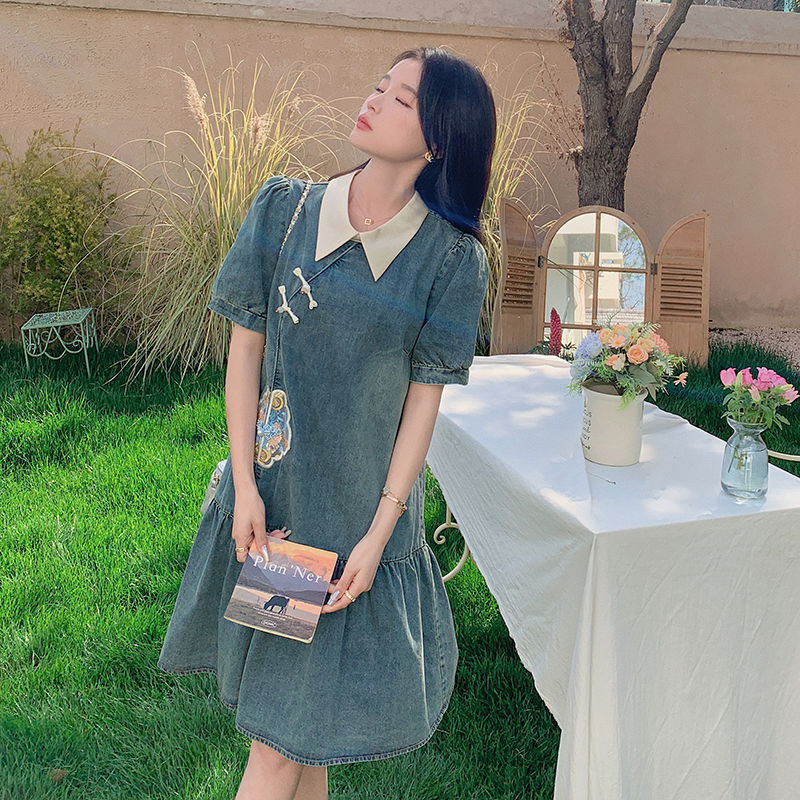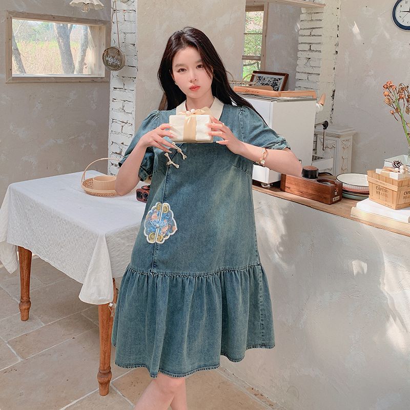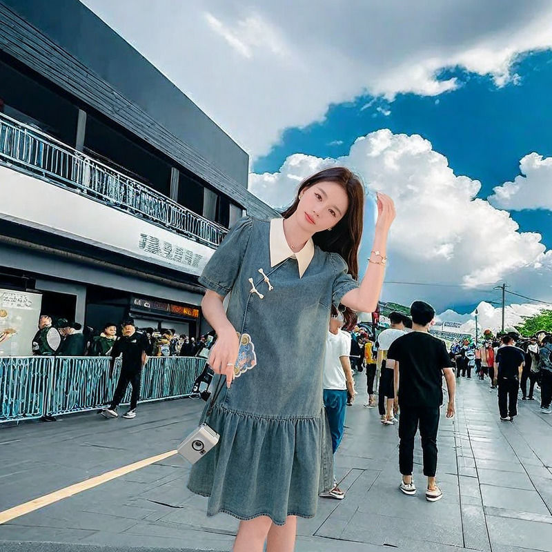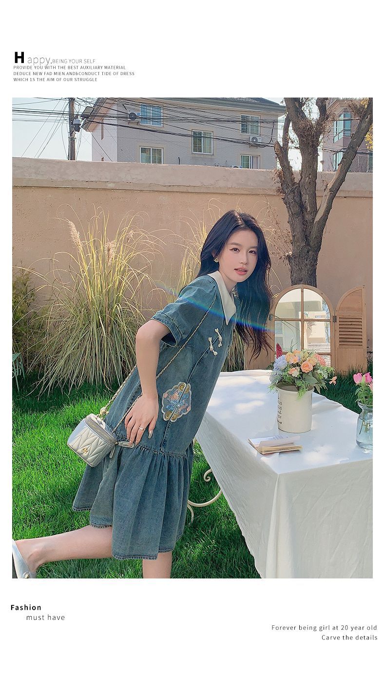 复古刺绣牛仔连衣裙女中长款夏新款国风显瘦减龄POLO领衬衫裙