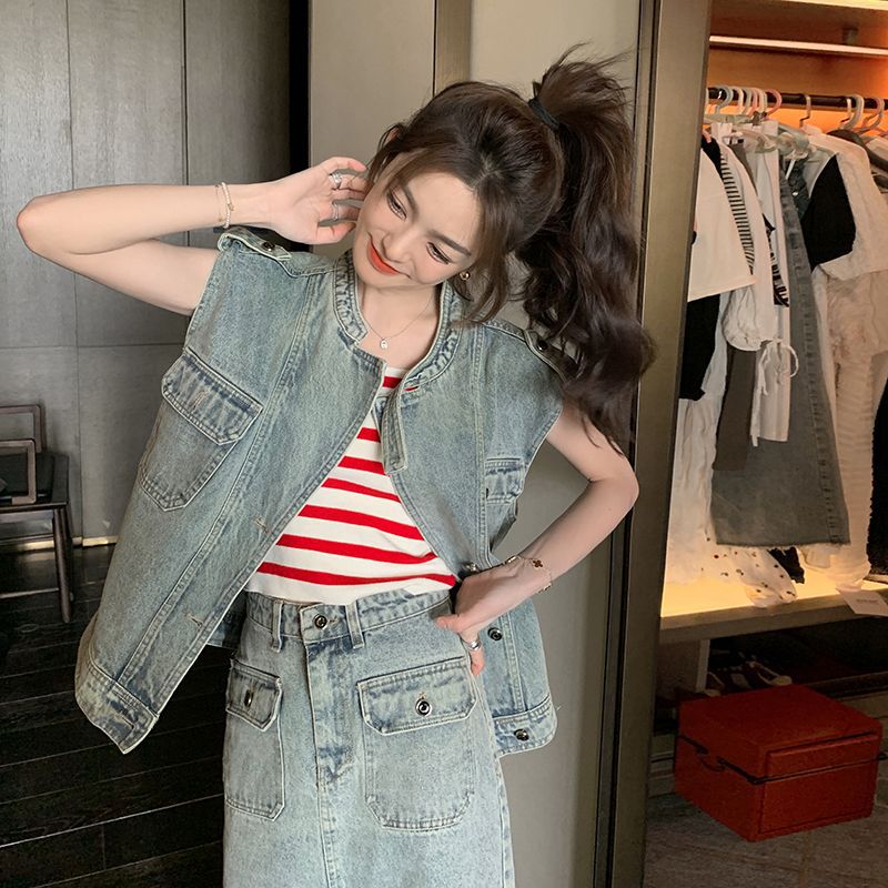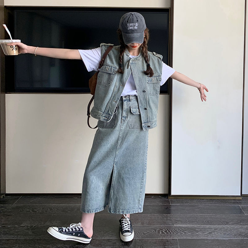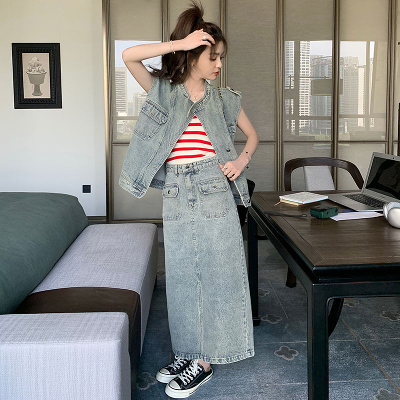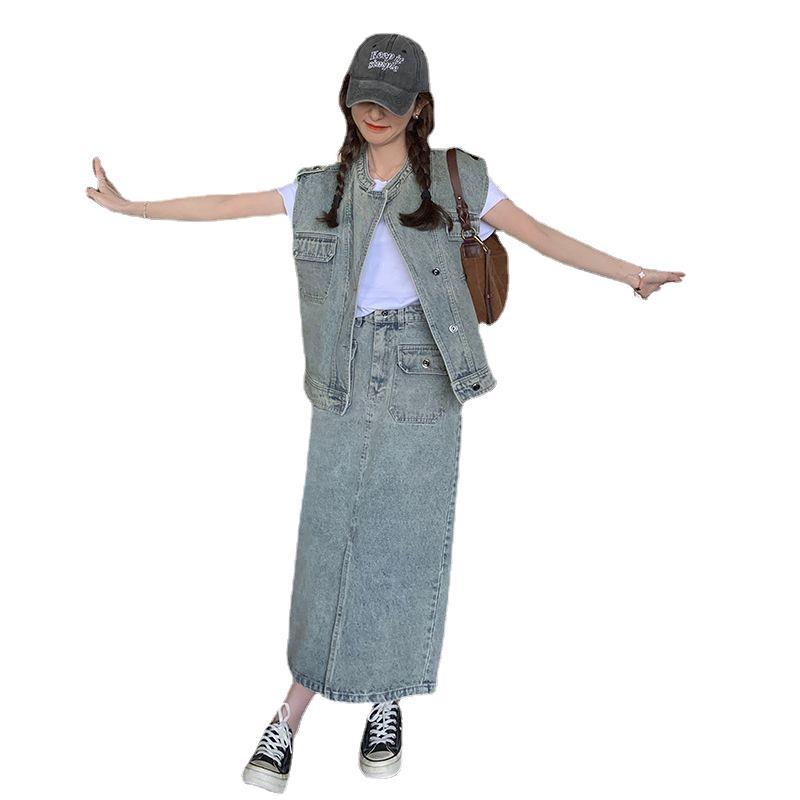 复古做旧牛仔时尚套装女夏新款时髦炸街马甲开叉半身裙两件套