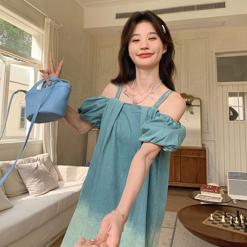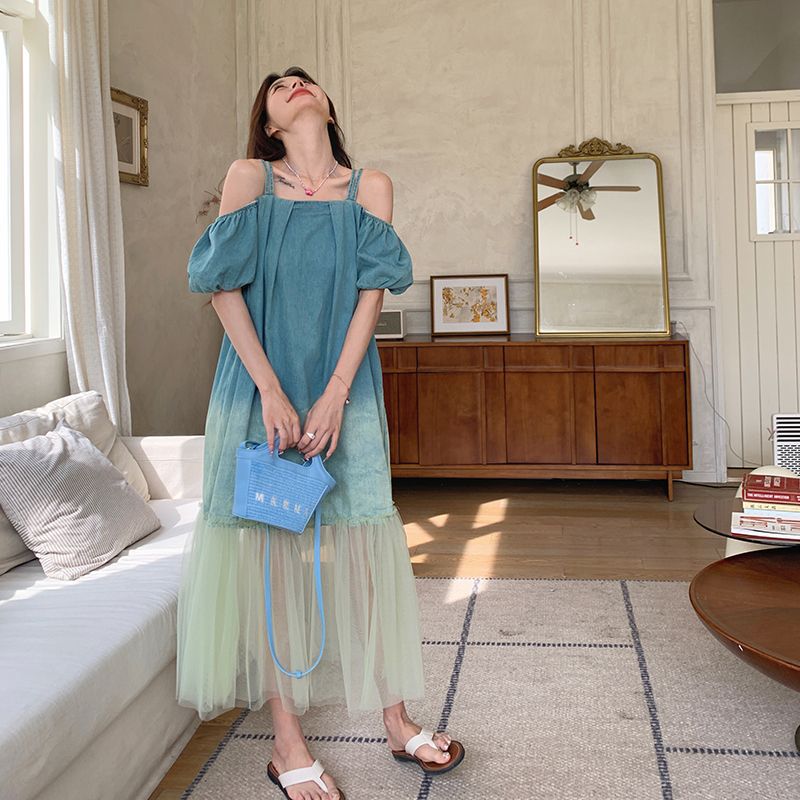 渐变蓝色露肩吊带连衣裙夏季新款法式绝美网纱拼接度假风长裙