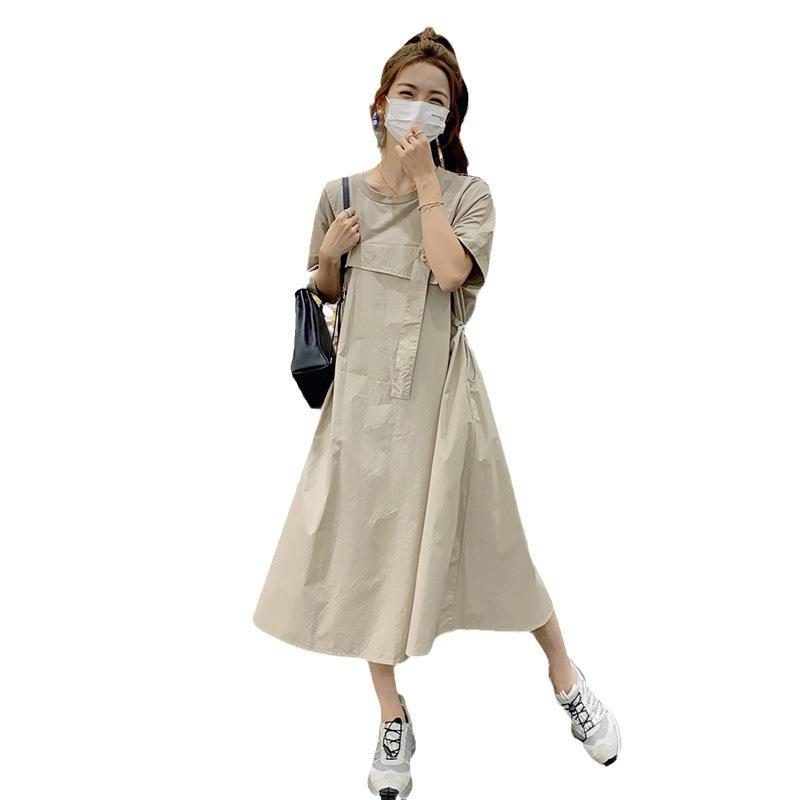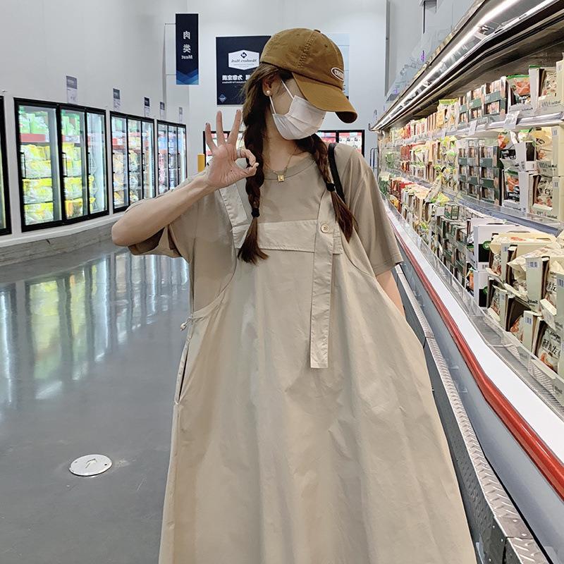 实拍宽松圆领轻复古抽绳收腰显瘦洋气灰卡其拼接假两件背带连衣裙