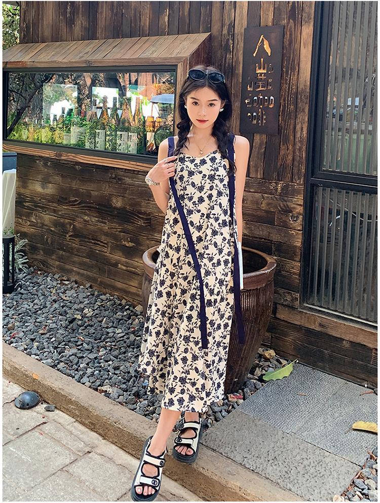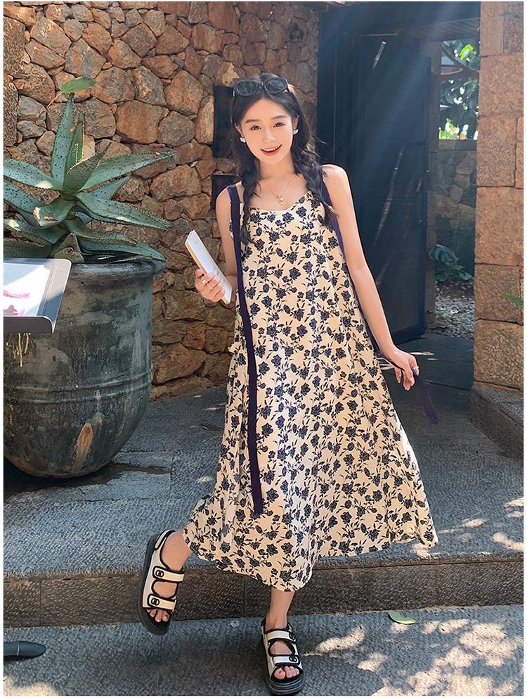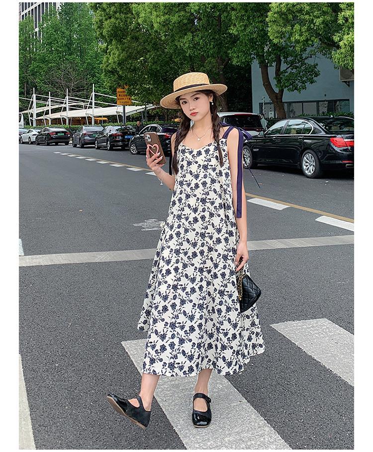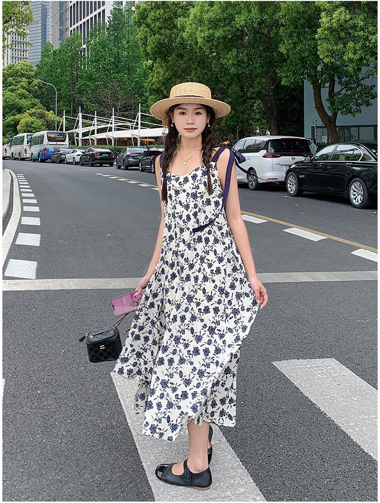 法式复古碎花吊带裙女夏新款宽松减龄小个子设计感飘带连衣裙