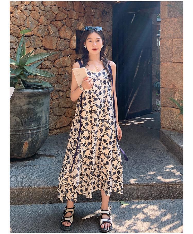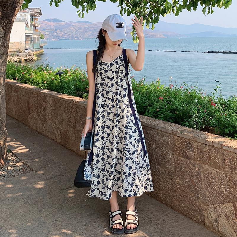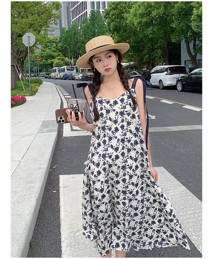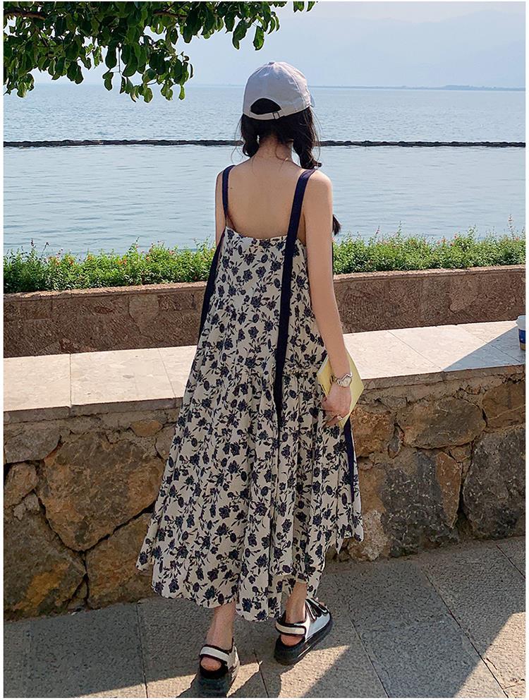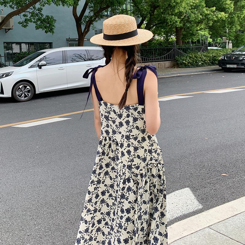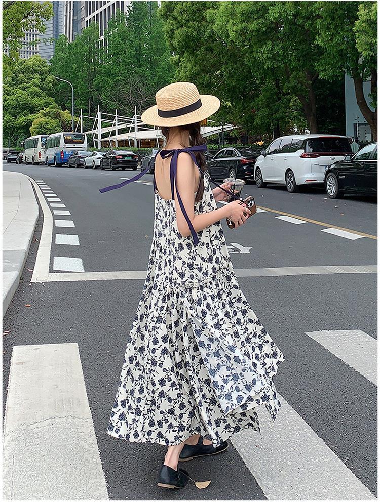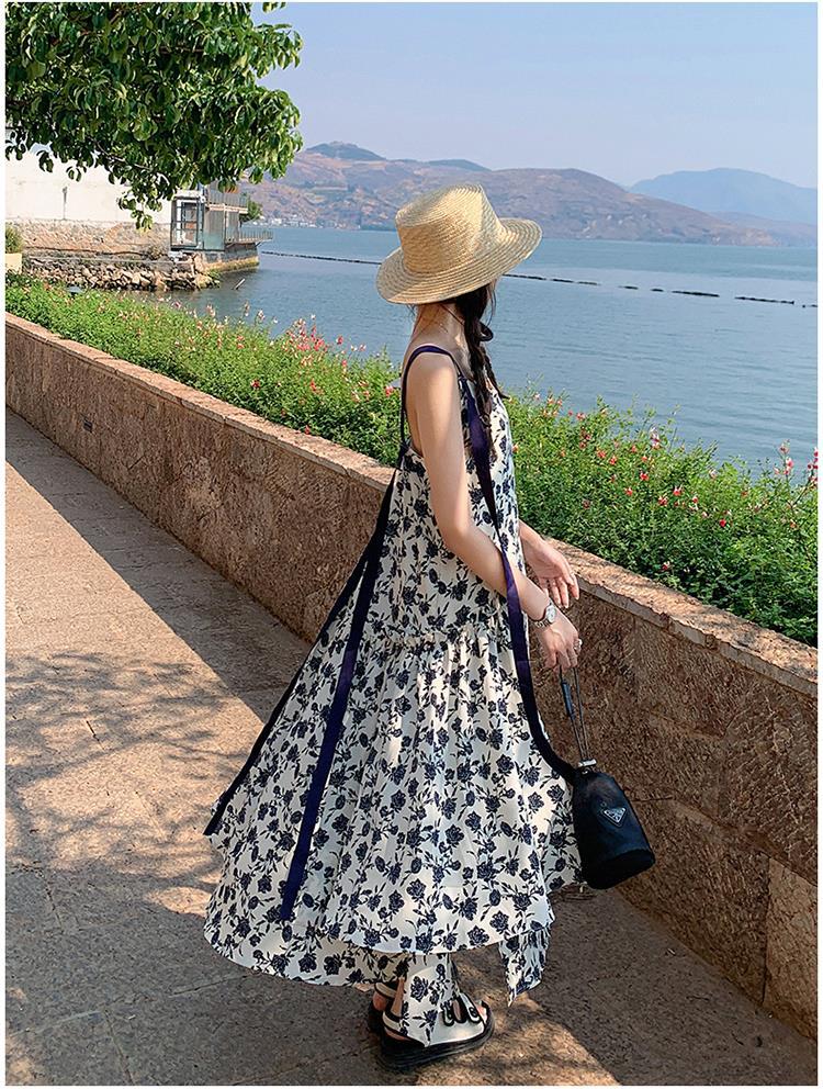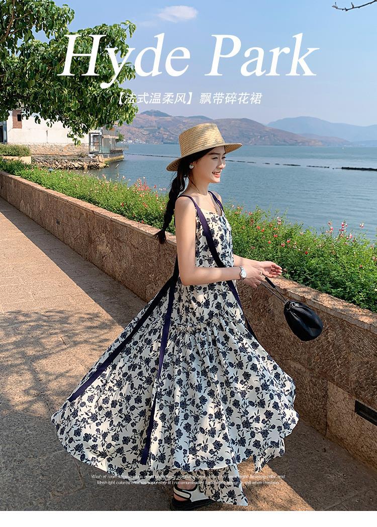 夏季法式优雅气质花卉时尚吊带裙超大摆印花系带露背长版连衣裙子