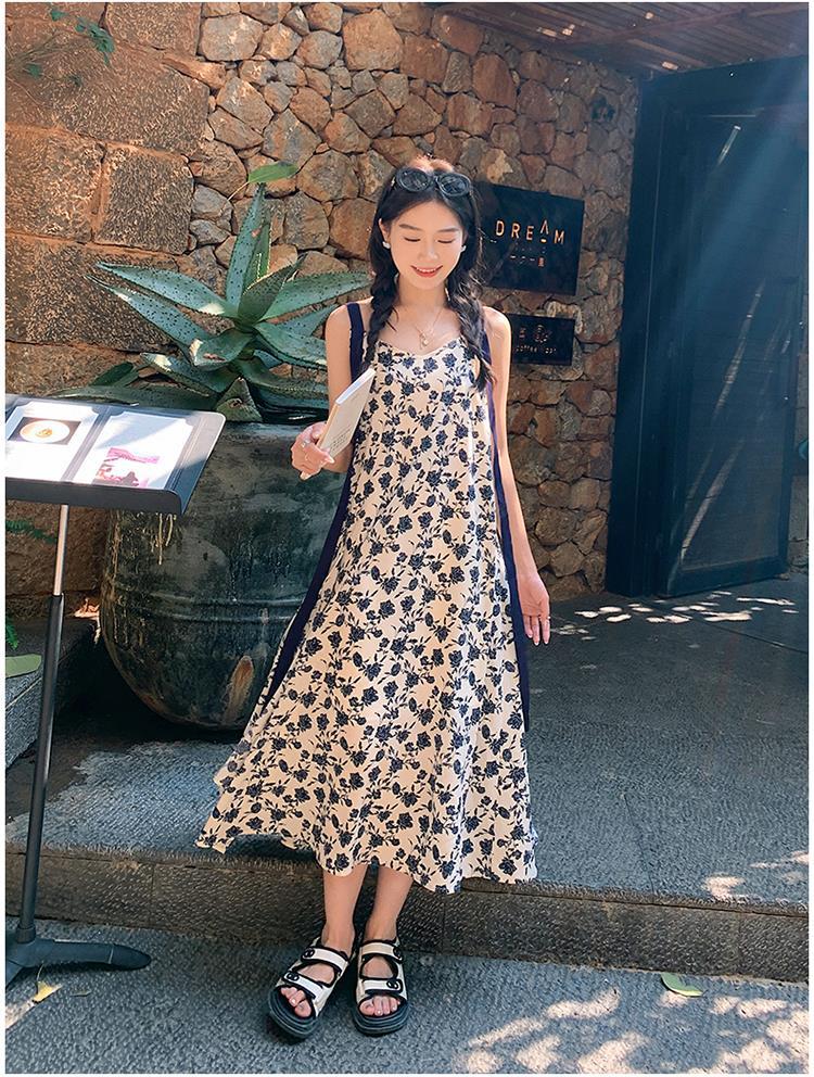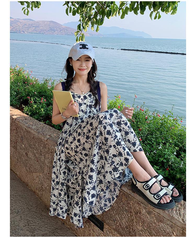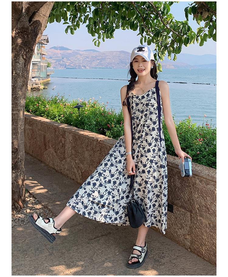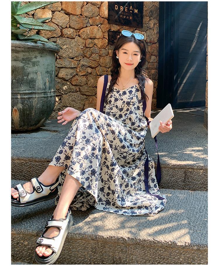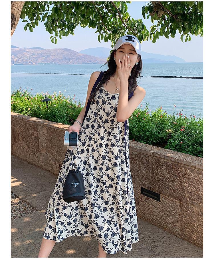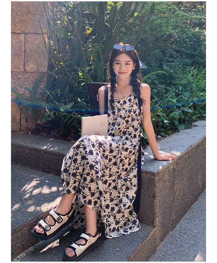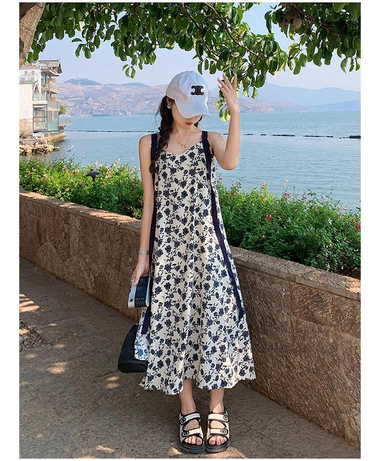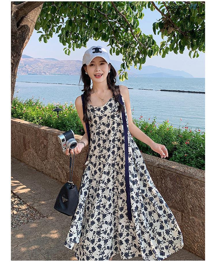 夏季法式优雅气质花卉时尚吊带裙超大摆印花系带露背长版连衣裙子