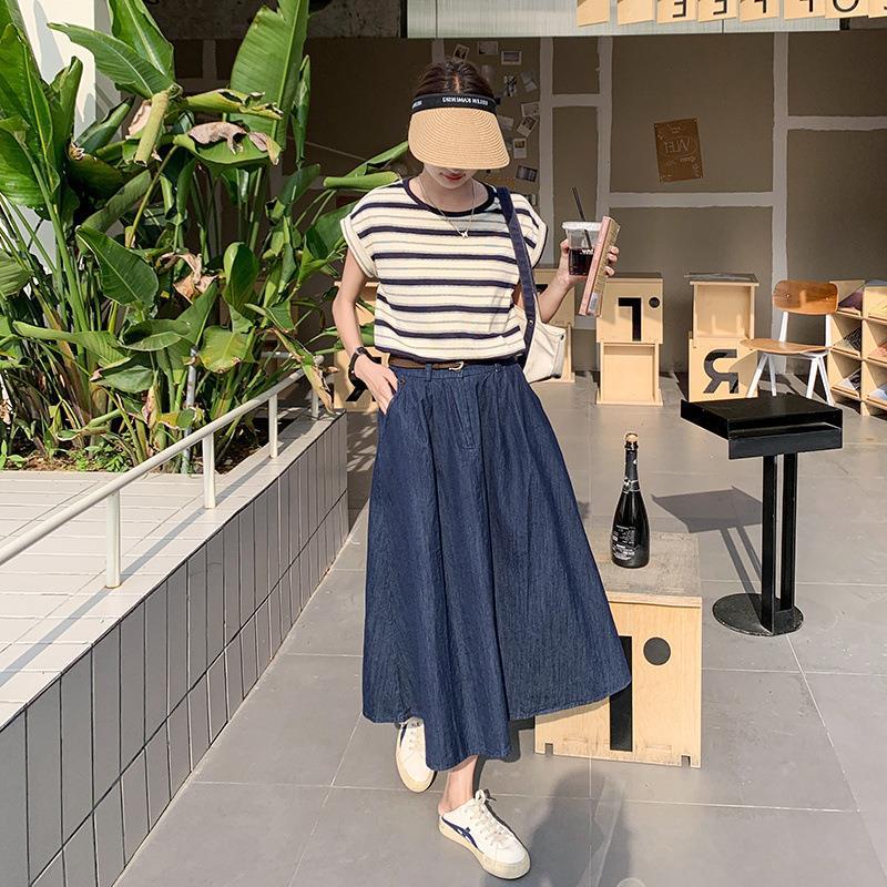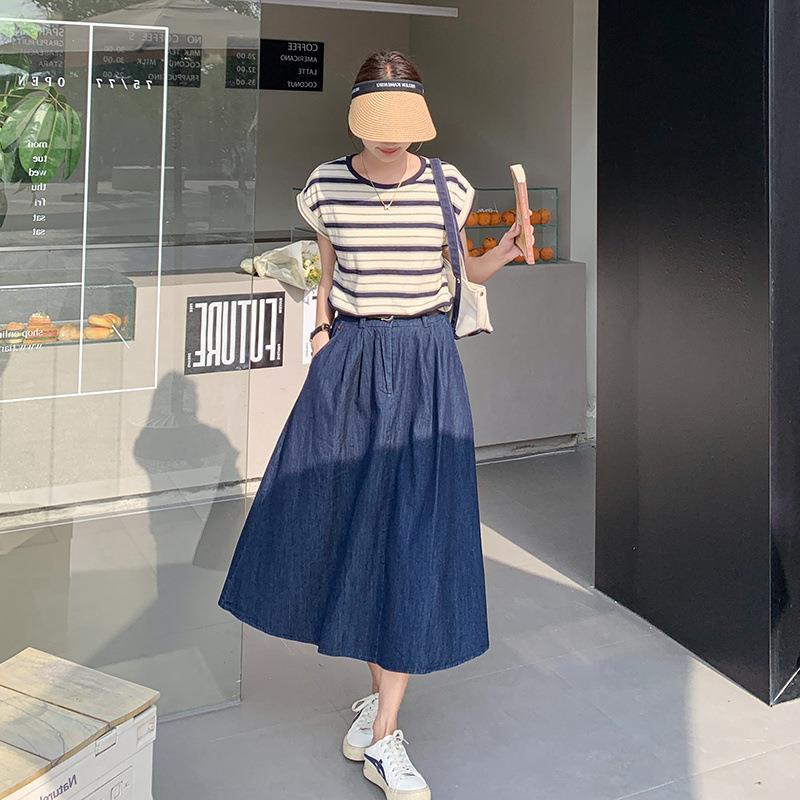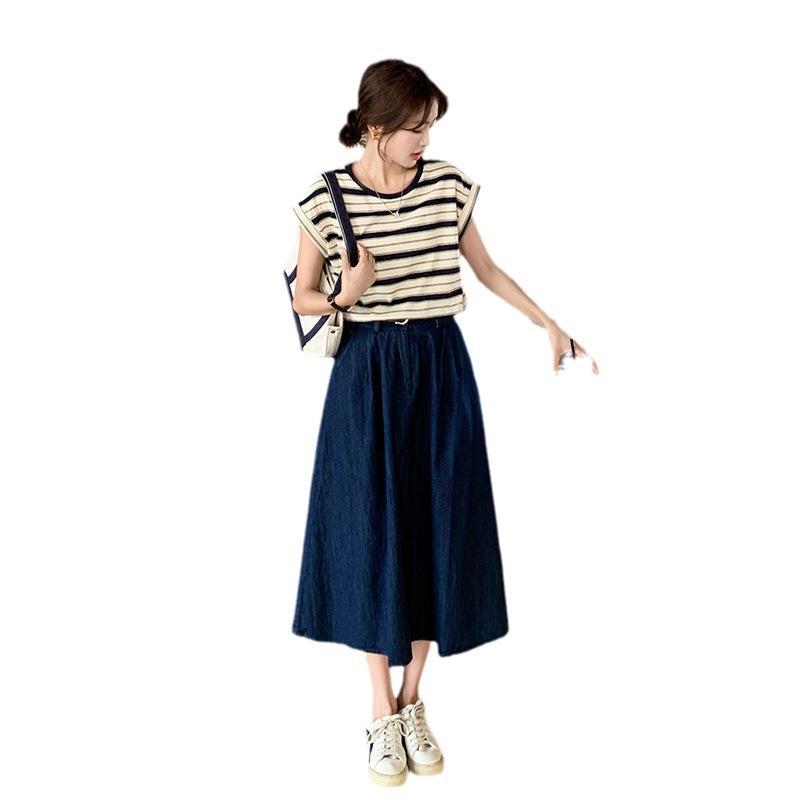 实拍休闲减龄宽松百搭圆领撞色条纹T恤高腰显瘦A字牛仔半裙套装女