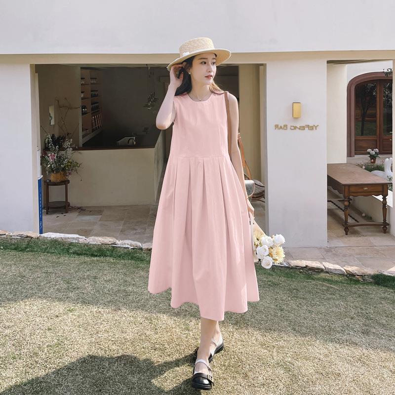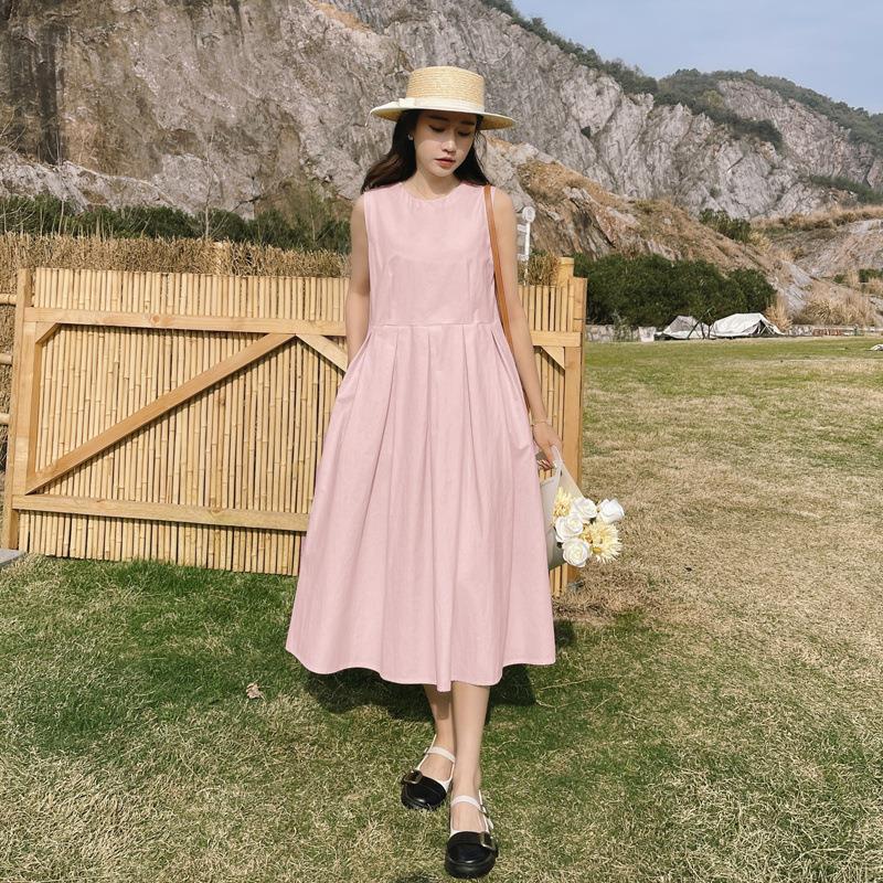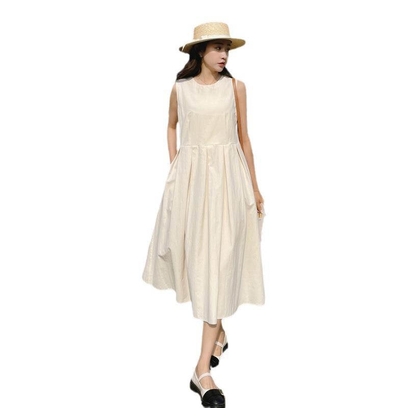 实拍法式小圆领无袖背心裙高腰拼接压褶大裙摆轻文艺米白色连衣裙