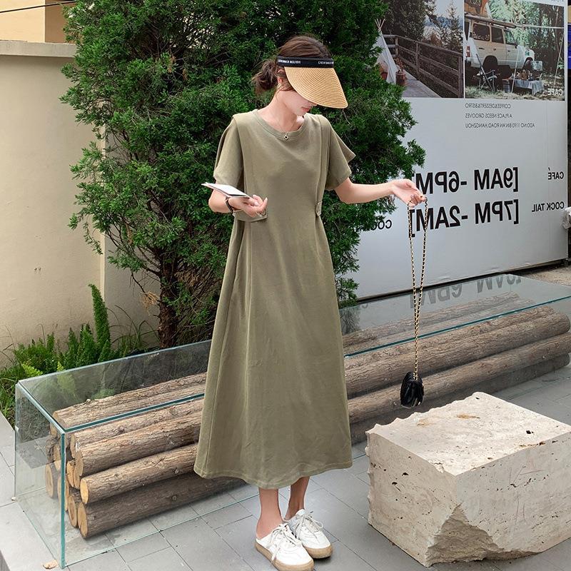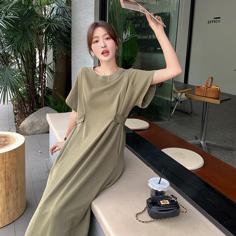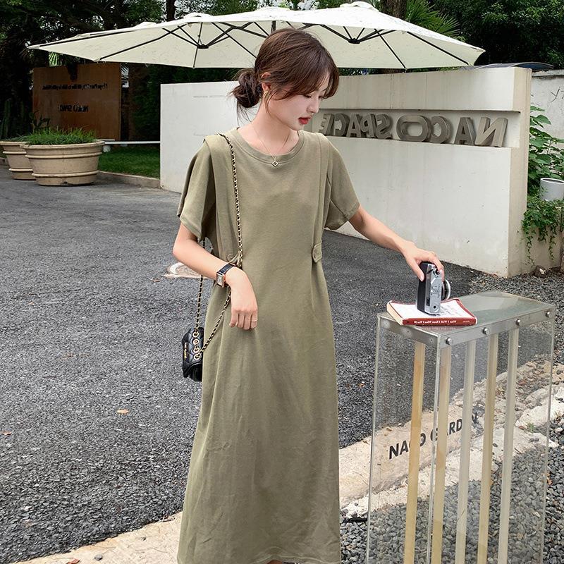 实拍ins宽松显瘦休闲风圆领T恤裙腰部拼接袢扣设计显白绿色连衣裙