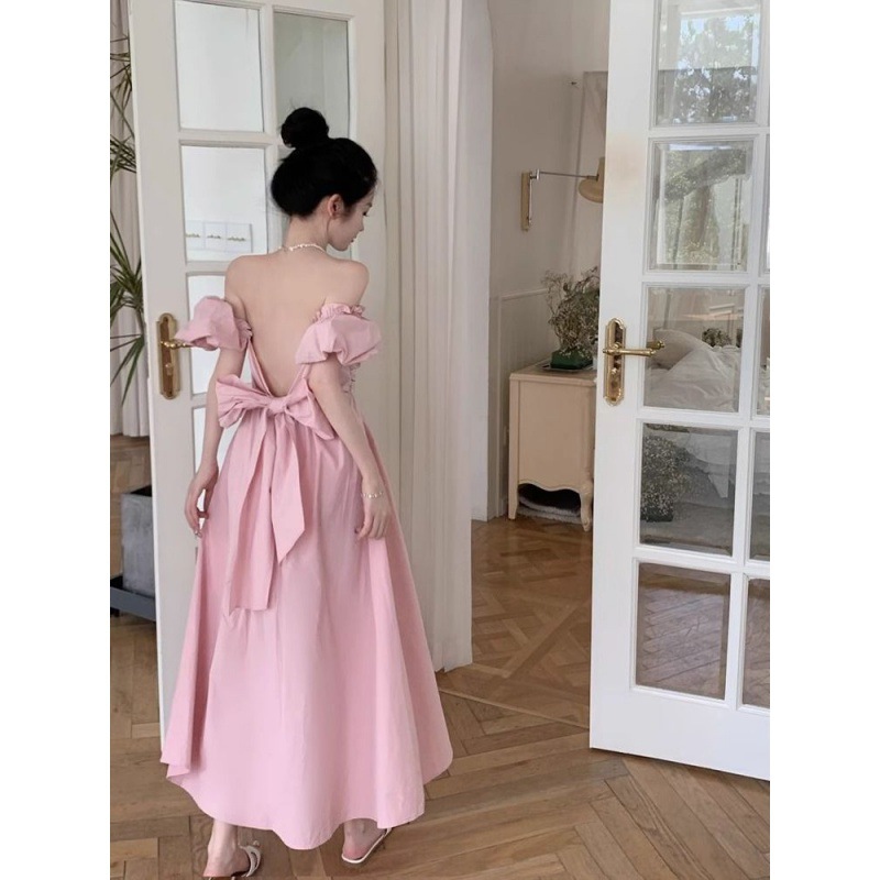 温柔风粉色泡泡袖一字肩连衣裙女夏季新款蝴蝶结露背显瘦气质长裙