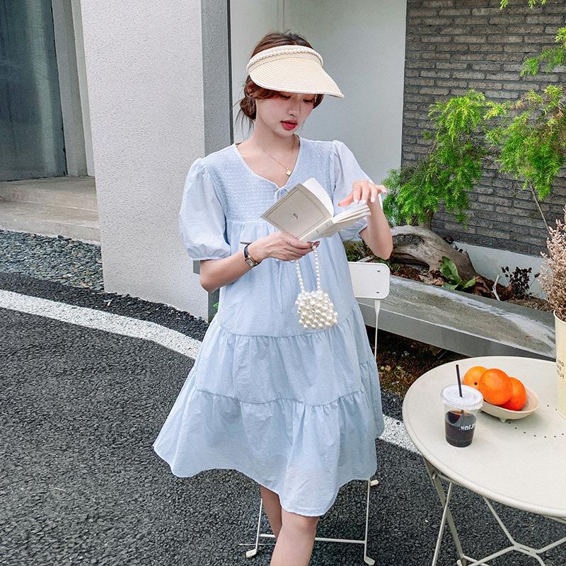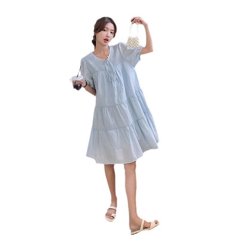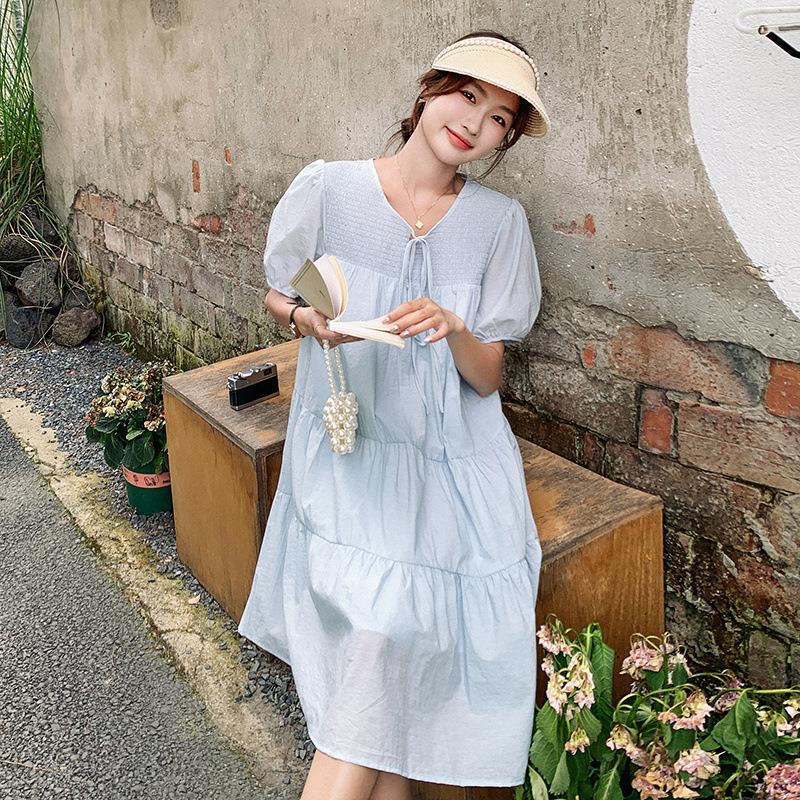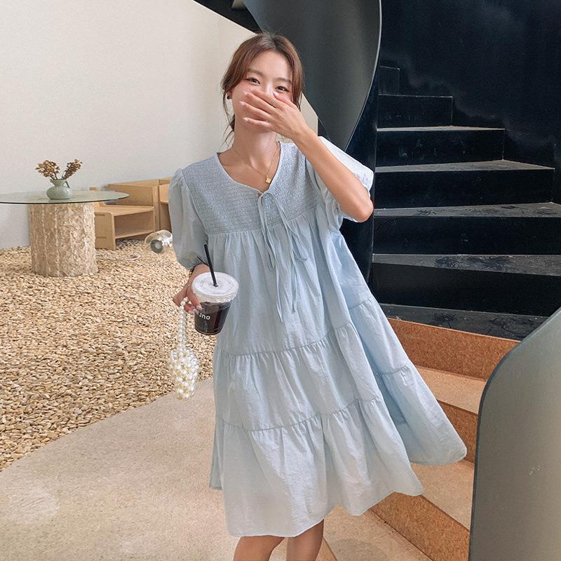 实拍小V领蝴蝶结系带元气少女感泡泡袖娃娃裙水蓝色A字裙摆连衣裙