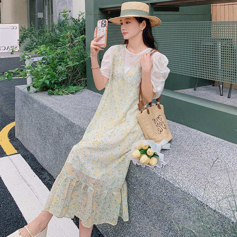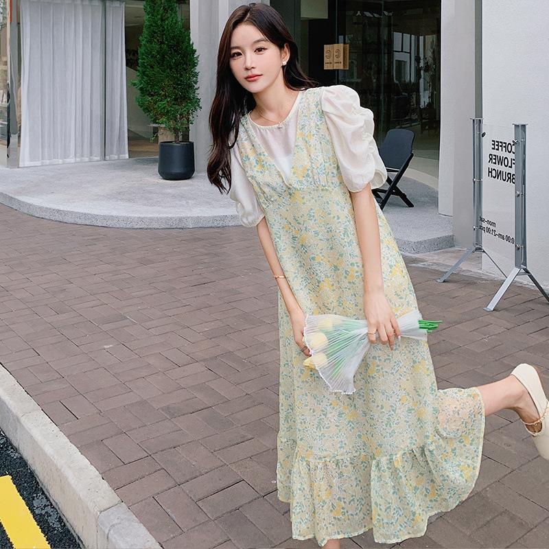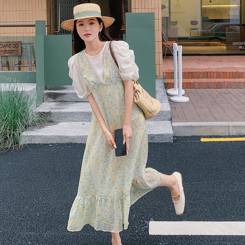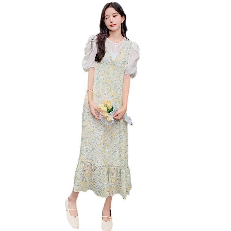 实拍ins抽褶泡泡袖上衣法式V领宽松显瘦褶皱鱼尾裙摆碎花裙套装女