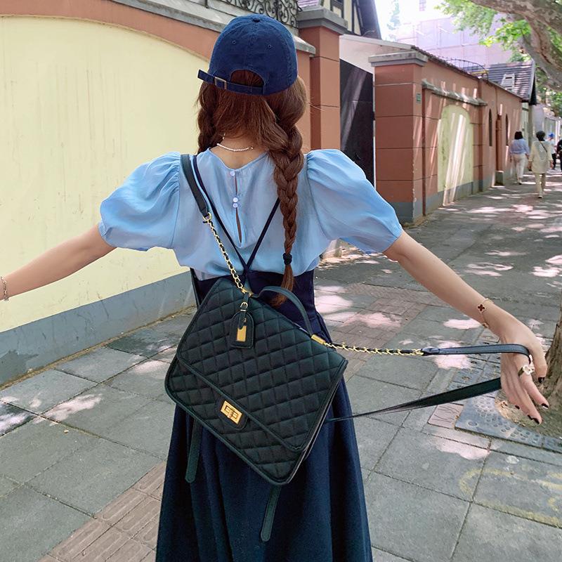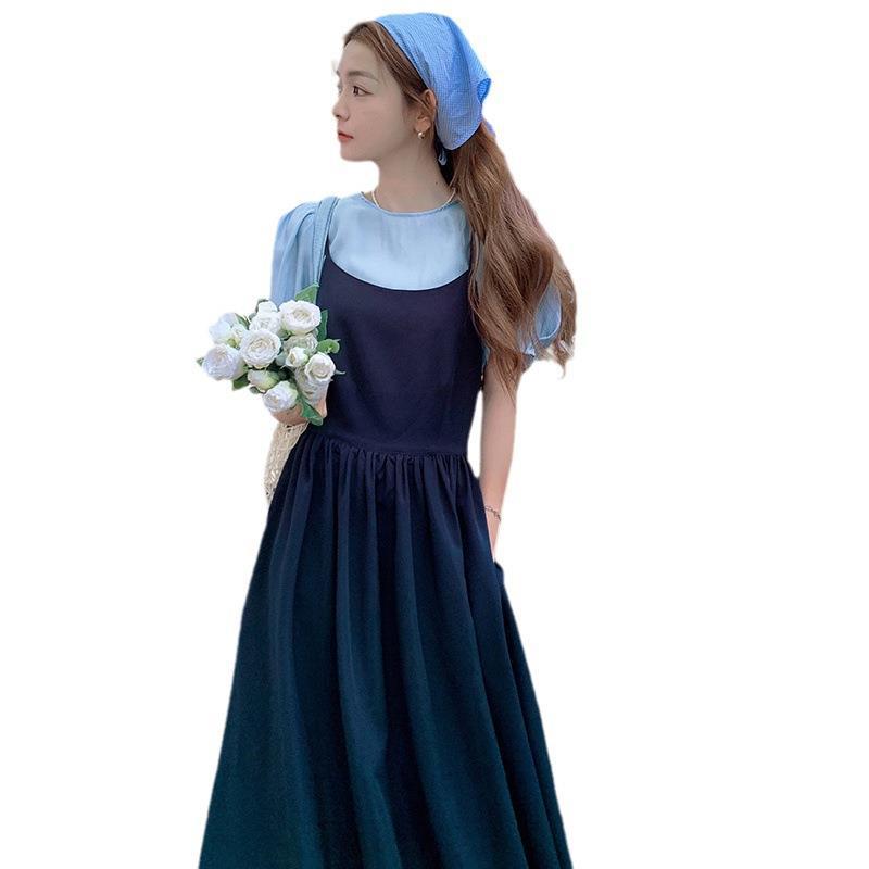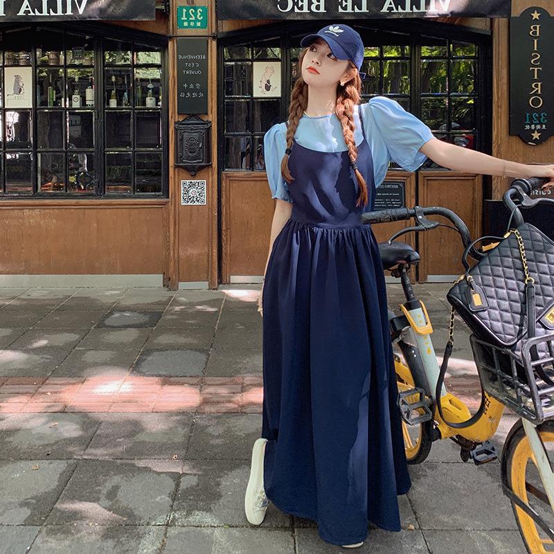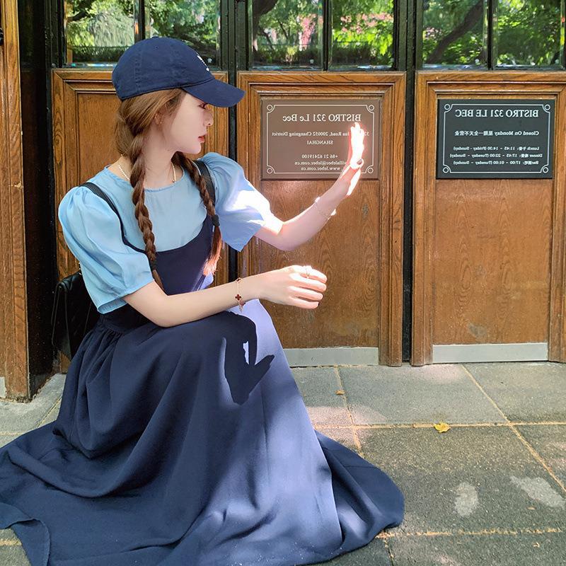 实拍法式泡泡袖上衣后背交叉绑带显瘦高腰复古大裙摆连衣裙两件套