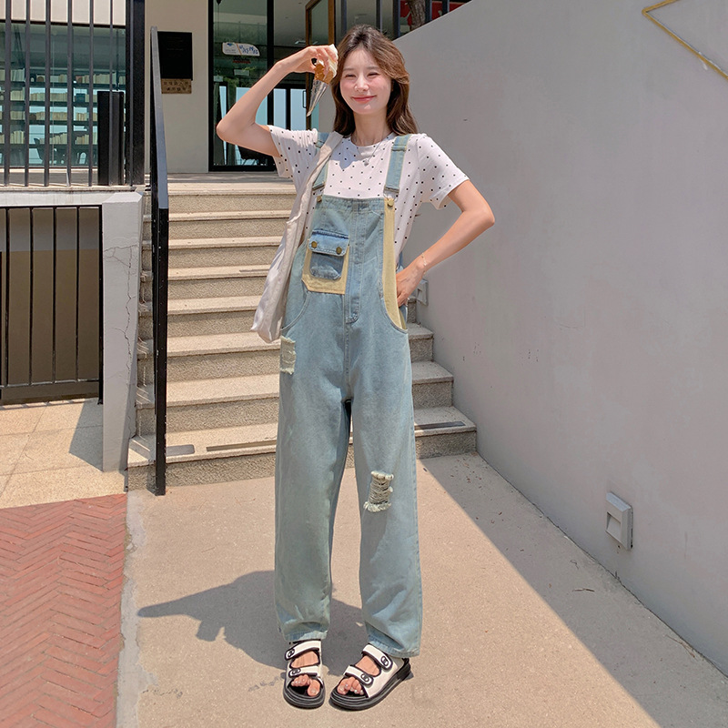 韩系休闲波点T恤牛仔背带裤套装女夏季新款吊带连体裤两件套