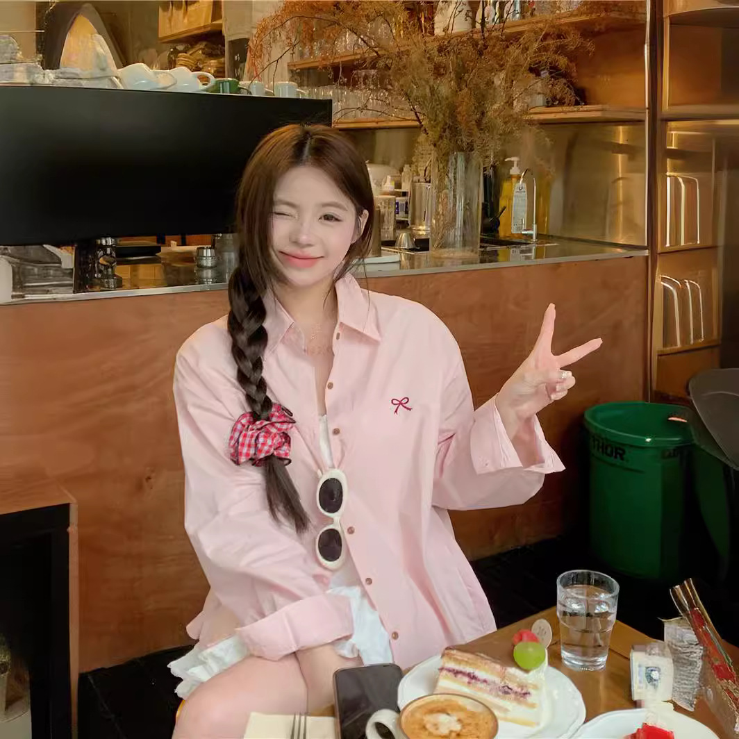 温柔风粉色蝴蝶结刺绣polo领衬衫女宽松休闲长袖上衣