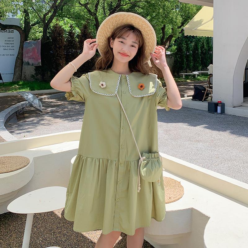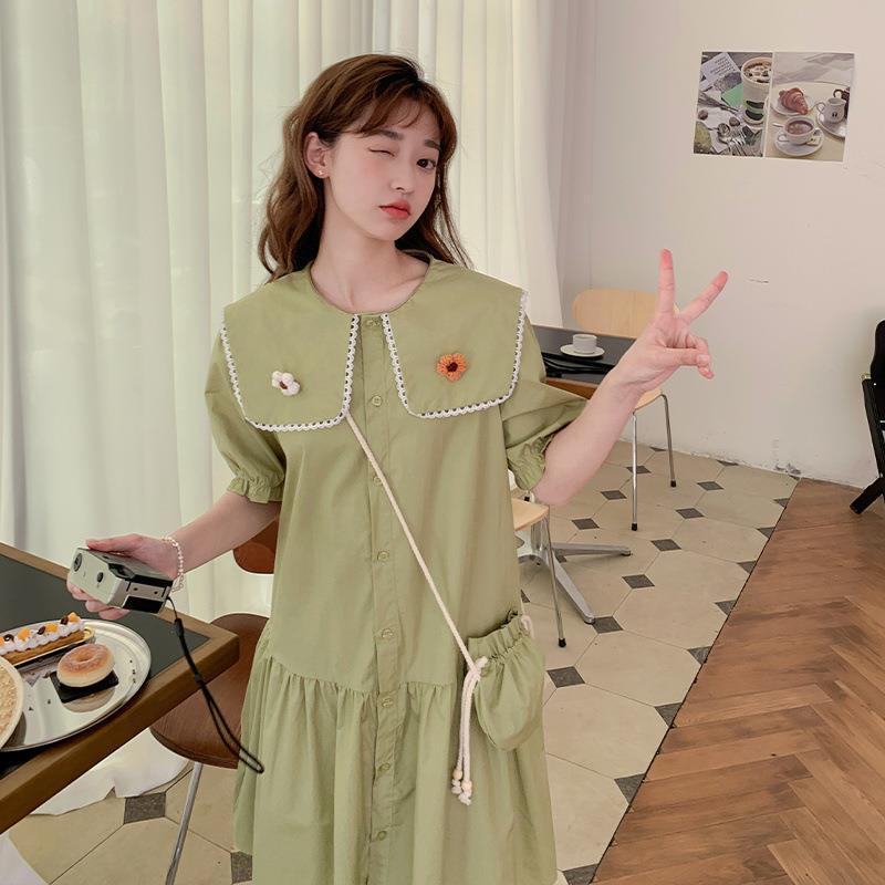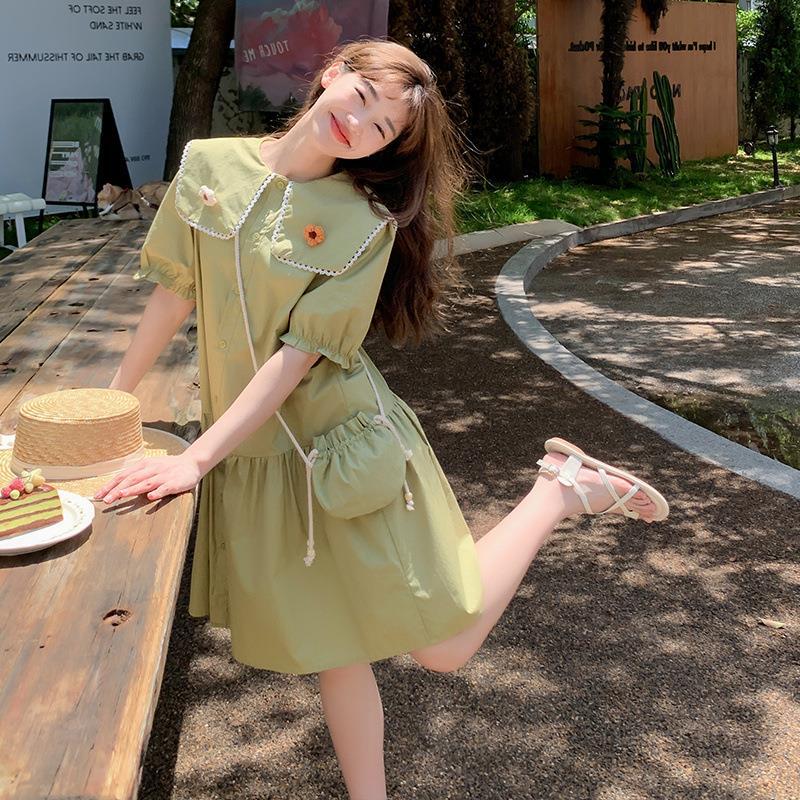 实拍海军领拼接小花设计chic甜美减龄青果绿单排扣宽松显瘦连衣裙