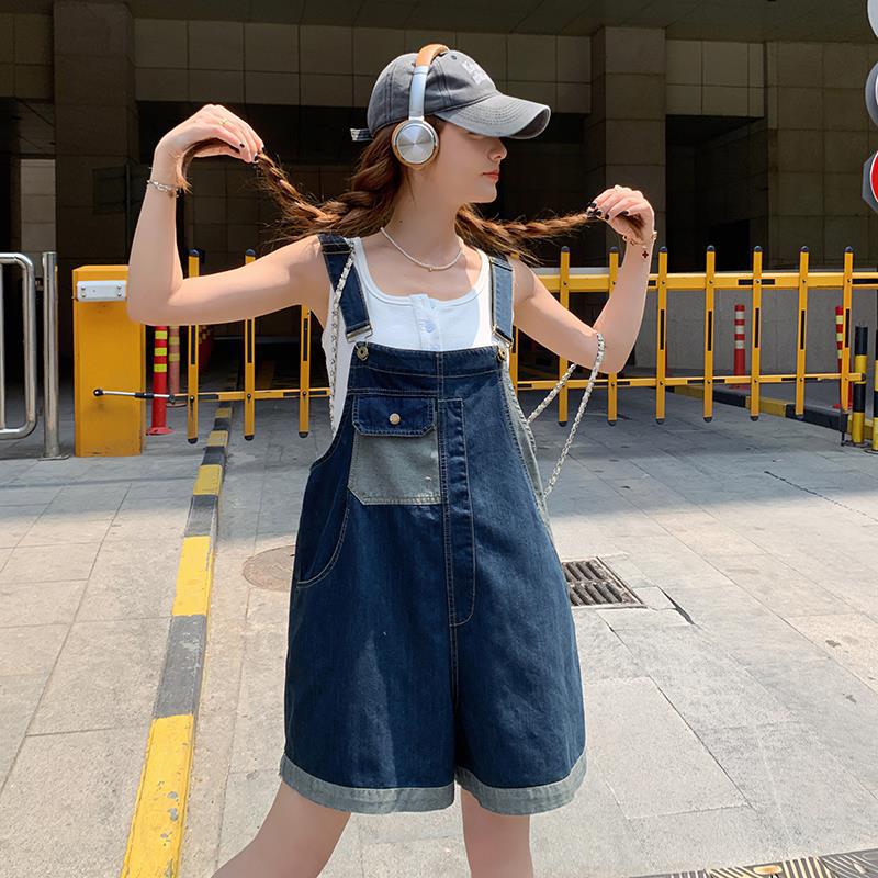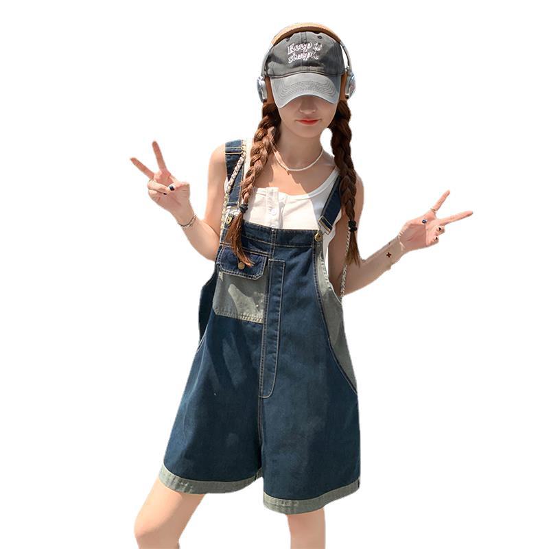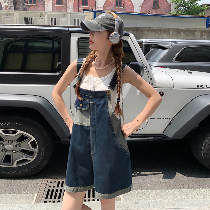 时尚牛仔背带裤女夏季年新款设计感拼接撞色宽松连体裤短裤潮
